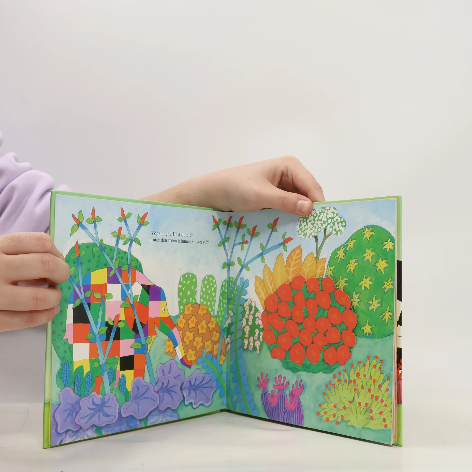 Elefant Elmar sucht aufgeregt das blaue Vögelchen, das er immerzu hört, aber nicht sehen und einfach nicht finden kann. Hat es sich etwa unter den roten Blumen versteckt?