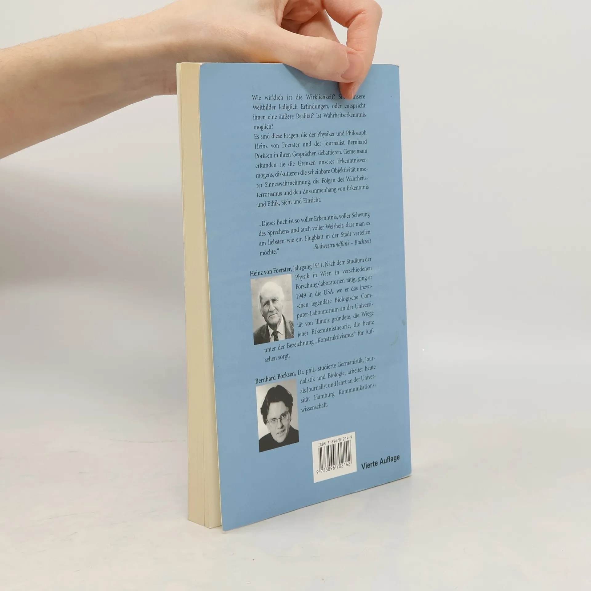 Der Physiker und Philosoph Heinz von Foerster und der Journalist Bernhard Pörksen erkunden die Grenzen unseres Erkenntnisvermögens, diskutieren die scheinbare Objektivität unserer Sinneswahrnehmung, die Folgen des Wahrheitsterrorismus und den Zusammenhang von Erkenntnis und Ethik, Sicht und Einsicht.