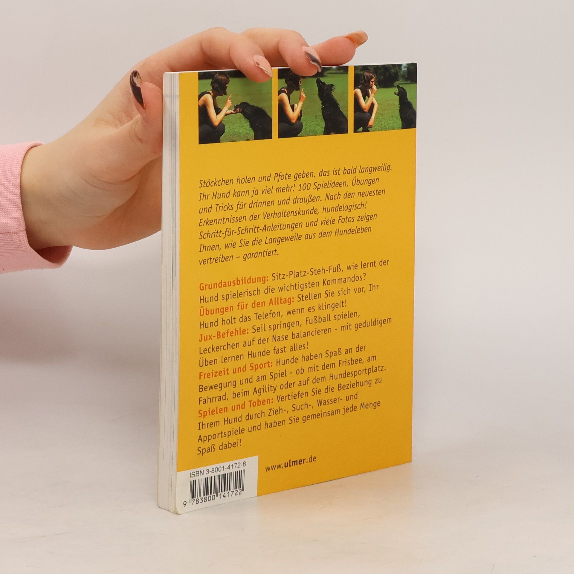 Grundausbildung: Sitz-Fuss-Steh-Platz, wie lernt der Hund spielerisch die wichtigsten Kommandos? Übungen für den Alltag: Stellen Sie sich vor, Ihr Hund holt das Telefon, wenn es klingelt! Jux-Befehle: Seil springen, Fussball spielen, Leckerchen auf der Nase balancieren - mit geduldigem Üben lernen Hunde fast alles! Freizeit und Sport: Hunde haben Spass an der Bewegung und am Spiel - ob mit dem Frisbee, am Fahrrad, beim Agility oder auf dem Hundesportplatz. Spielen und Toben: Vertiefen Sie die Beziehung zu Ihrem Hund durch Zieh-, Such-, Wasser- und Apportspiele und haben Sie gemeinsam jede Menge Spass dabei!