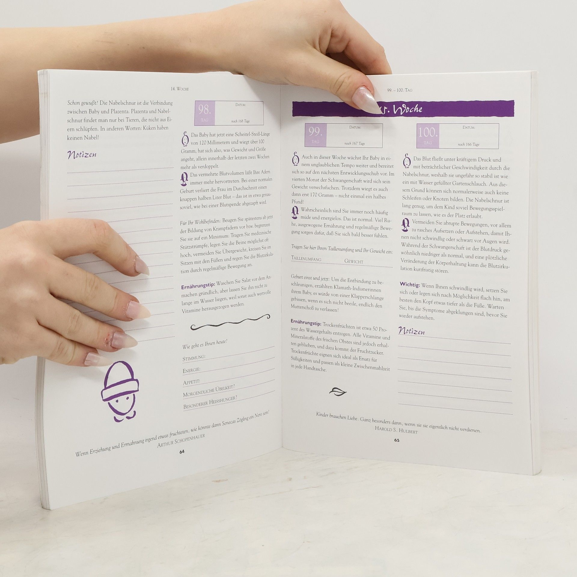 Tag für Tag das Wunder des Lebens bewusst erfahren. Die Schwangerschaft ist für jede Frau eine ganz besondere ZEit. Was könnte jetzt spannender sein als herauszufinden, was an jedem einzelnen Tag im Leben ihres Kindes vor sich geht? Dieses Schwangerschaftstagebuch bietet Ihnen die einmalige Chance, tagtäglich alle Entwicklungen und Veränderungen im Körper des Babys mitzuerleben - und Ihren eigenen besser zu verstehen. Hinweise zur Ernährung, Information zu Gesundheit und Säuglingspflege sowie eine Fülle an speziellen Tipps für das körperliche und vor allem emotionale Wohlergehen der werdenden Mutter machen dieses Buch zu einem idealen Begleiter, den sich jede Schwangere gönnen sollte. Gestalten Sie durch eigene Eintragungen und persönliche Notizen das ganz individuelle Tagebuch zu Ihrer Schwangerschaft.