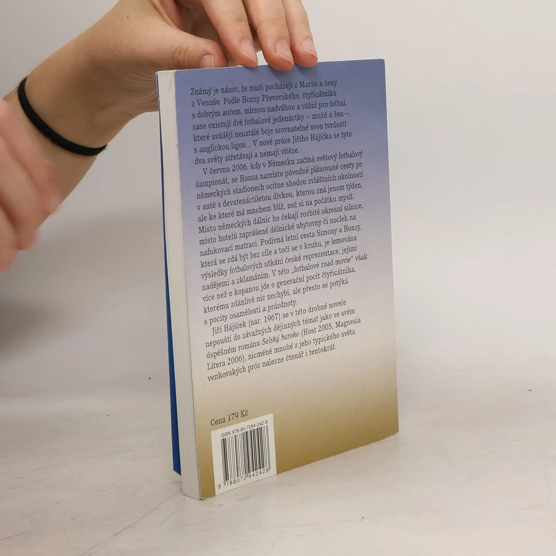 Známý je názor, že muži pocházejí z Marsu a ženy z Venuše. Podle Honzy Převorského, čtyřicátníka s dobrým autem, mírnou nadváhou a vášní pro fotbal, zase existují dvě fotbalové jedenáctky – mužů a žen –, které svádějí neustálé boje srovnatelné svou tvrdostí s anglickou ligou... V nové próze Jiřího Hájíčka se tyto dva světy střetávají a nemají vítěze. V červnu 2006, kdy v Německu začíná světový fotbalový šampionát, se Honza namísto původně plánované cesty po německých stadionech ocitne shodou zvláštních okolností v autě s devatenáctiletou dívkou, kterou zná jenom týden, ale ke které má mnohem blíž, než si na počátku myslí. Místo německých dálnic ho čekají rozbité okresní silnice, místo hotelů zaprášené dělnické ubytovny či nocleh na nafukovací matraci. Podivná letní cesta Simony a Honzy, která se zdá být bez cíle a točí se v kruhu, je lemována výsledky fotbalových utkání české reprezentace, jejími nadějemi a zklamáním. V této „fotbalové road movie" však více než o kopanou jde o generační pocit čtyřicátníka, kterému zdánlivě nic nechybí, ale přesto se potýká s pocity osamělosti a prázdnoty. Jiří Hájíček se v této drobné novele nepouští do závažných dějinných témat jako ve svém úspěšném románu Selský baroko (2005), nicméně mnohé z jeho typického světa venkovských próz nalezne čtenář i tentokrát.