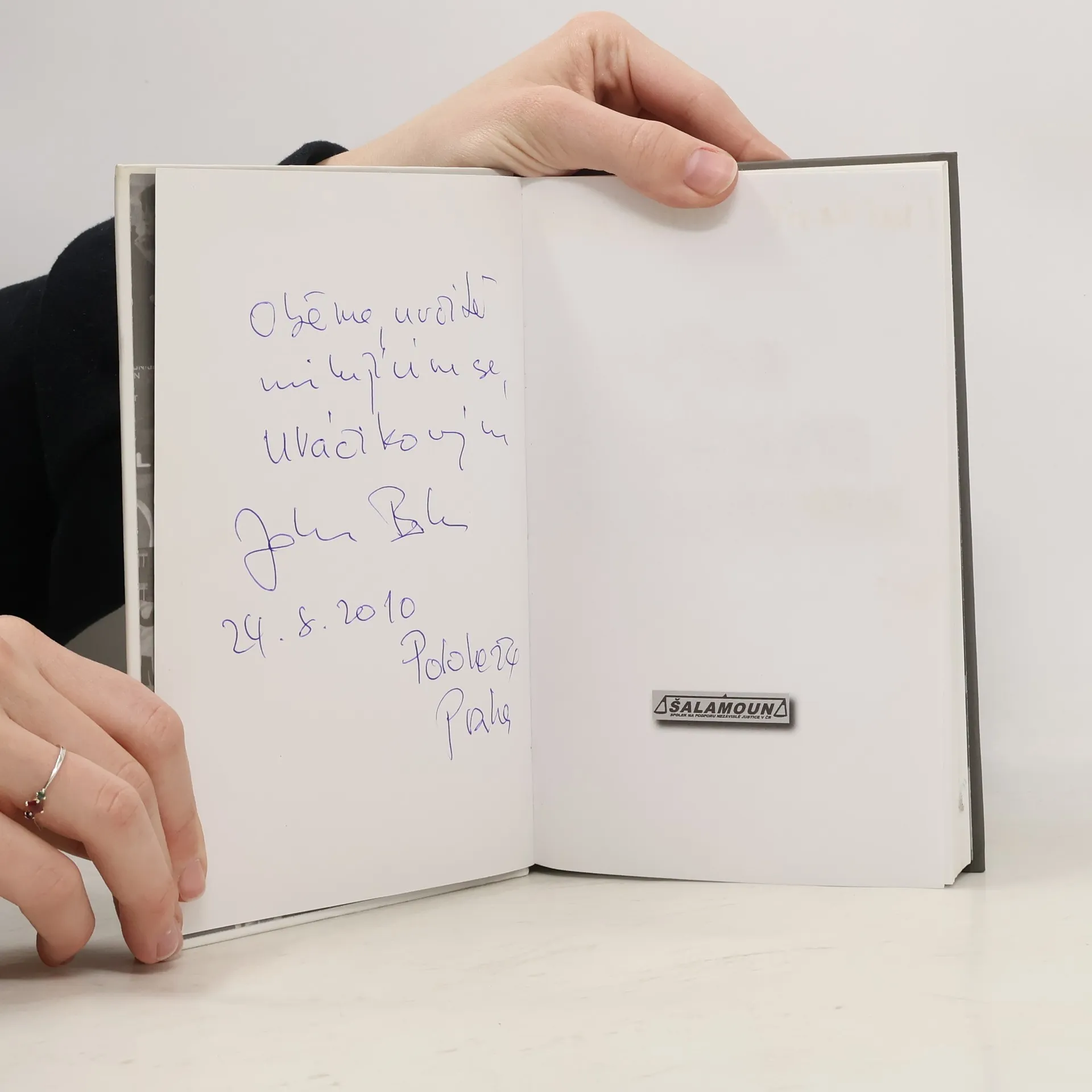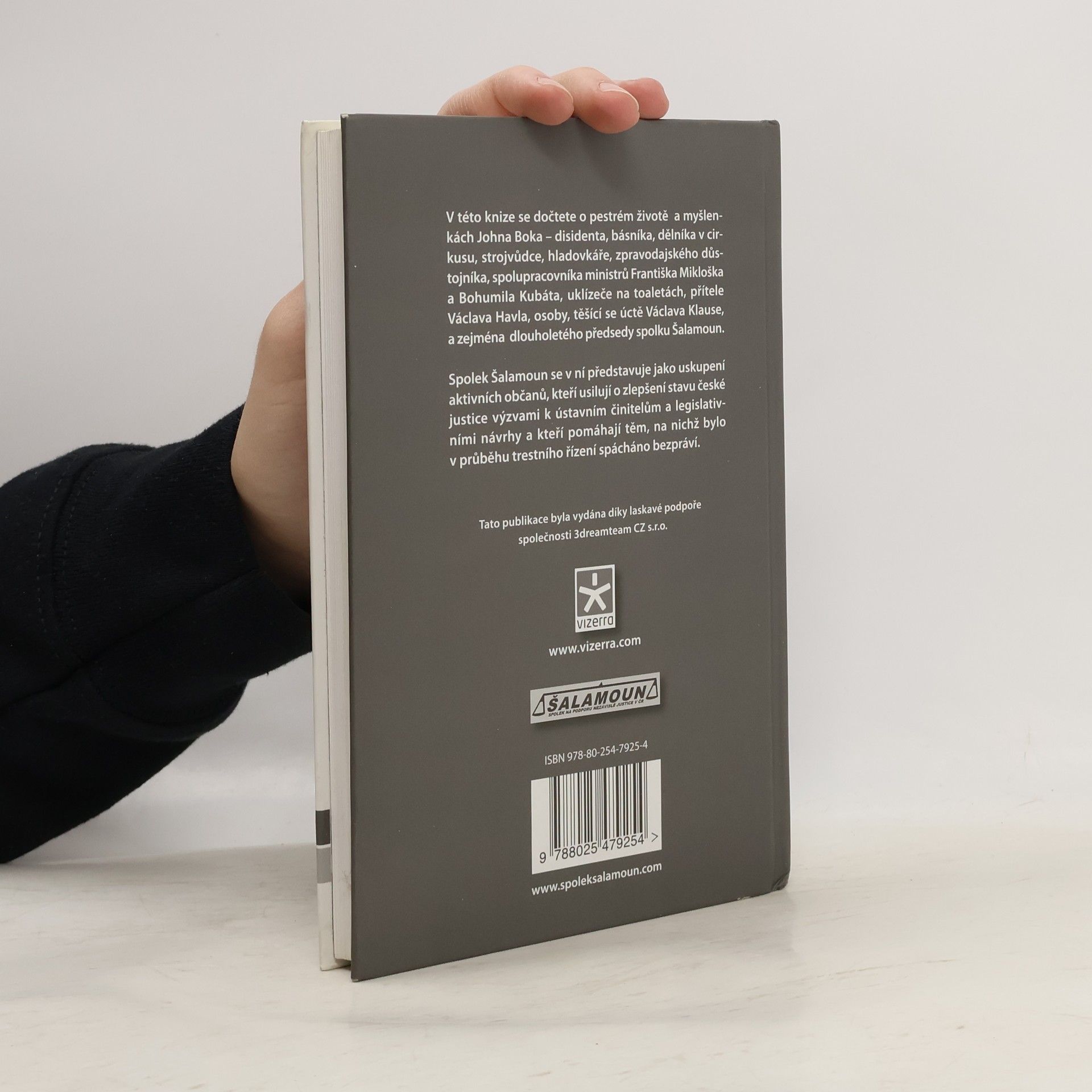 O spolku Šalamoun a jeho předsedovi Johnu Bokovi V této knize se dočtete o pestrém životě a myšlenkách Johna Boka - disidenta, básníka, dělníka v cirkusu, strojvůdce, hladovkáře, zpravodajského důstojníka, spolupracovníka ministrů Františka Mikloška a Bohumila Kubáta, uklízeče na toaletách, přítele Václava Havla, osoby, těšící se úctě Václava Klause, a zejména dlouholetého předsedy spolku Šalamoun. Spolek Šalamoun se v knize představuje jako uskupení aktivních občanů, kteří usilují o zlepšení stavu české justice výzvami k ústavním činitelům a legislativními návrhy a kteří pomáhají těm, na nichž bylo v průběhu trestního řízení spácháno bezpráví.