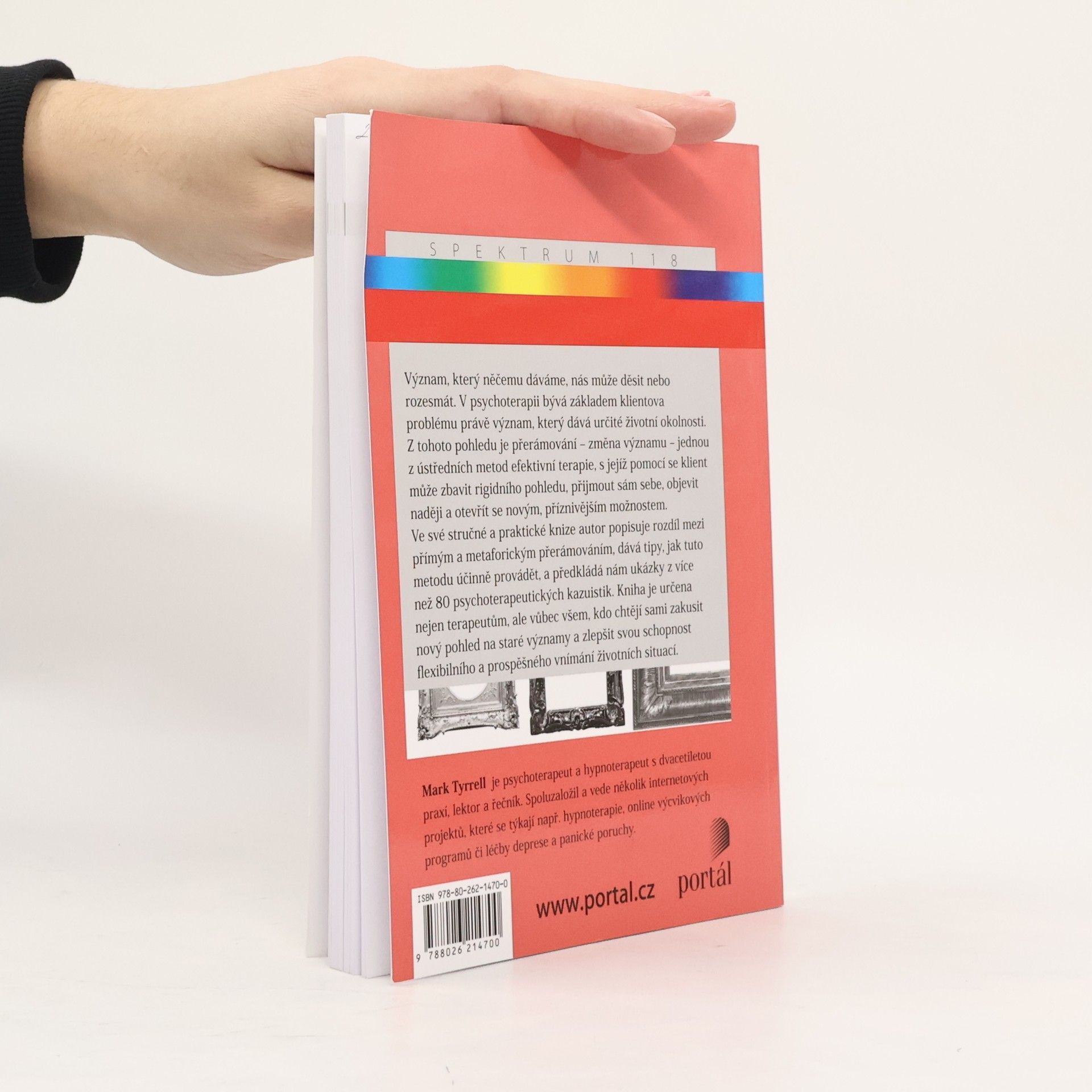 Význam, který něčemu dáváme, nás může děsit nebo rozesmávat. V psychoterapii bývá základem klientova problému právě význam, který klient dává určité životní okolnosti. Z tohoto pohledu je přerámování – změna významu – jednou z ústředních metod efektivní terapie, s jejíž pomocí se klient může zbavit rigidního pohledu, přijmout sám sebe, objevit naději a otevřít se novým, příznivějším možnostem. Ve své stručné a praktické knize autor popisuje rozdíl mezi přímým a metaforickým přerámováním, dává tipy, jak tuto metodu účinně provádět, a předkládá nám ukázky z více než 80 psychoterapeutických kazuistik. Kniha je určena nejen terapeutům, ale vůbec všem, kdo chtějí sami zakusit nový pohled na staré významy a zlepšit svou schopnost flexibilního a prospěšného vnímání životních situací. Mark Tyrrell je psychoterapeut a hypnoterapeut s dvacetiletou praxí, lektor a řečník. Spoluzaložil a vede několik internetových projektů, které se týkají např. hypnoterapie, online výcvikových programů či léčby deprese a panické poruchy.
