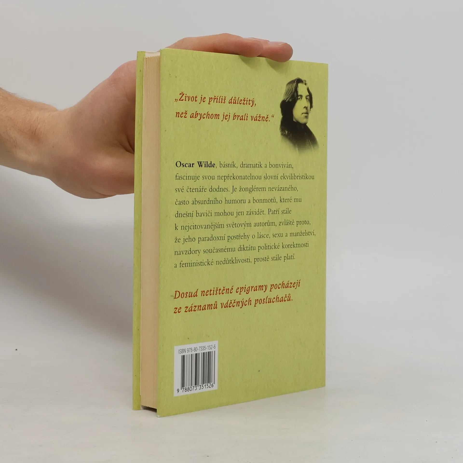 Oscar Wilde (1854 - 1900), básník, dramatik a bonviván, fascinuje svou nepřekonatelnou slovní ekvilibristikou své čtenáře dodnes. Je žonglérem nevázaného, často absurdního humoru a bonmotů, které mu dnešní baviči mohou jen závidět. Patří stále k nejcitovanějším světovým autorům, zvláště proto, že jeho paradoxní postřehy o lásce, sexu a manželství, navzdory současnému diktátu politické korektnosti a feministické nedůtklivosti, prostě stále platí. "Do umění života jsem vložil svou genialitu, do svého díla jenom svůj talent." "Život je příliš důležitý, než abychom jej brali vážně." Kromě bonmotů a průpovědí, jejichž výběr přináší tato kniha, patří k nejslavnějším ze spisovatelových děl jeho jediný román Obraz Doriana Graye, divadelní hry Salome, Ideální manžel a Jak je důležité míti Filipa a také pohádky (např. Šťastný princ a jiné pohádky).