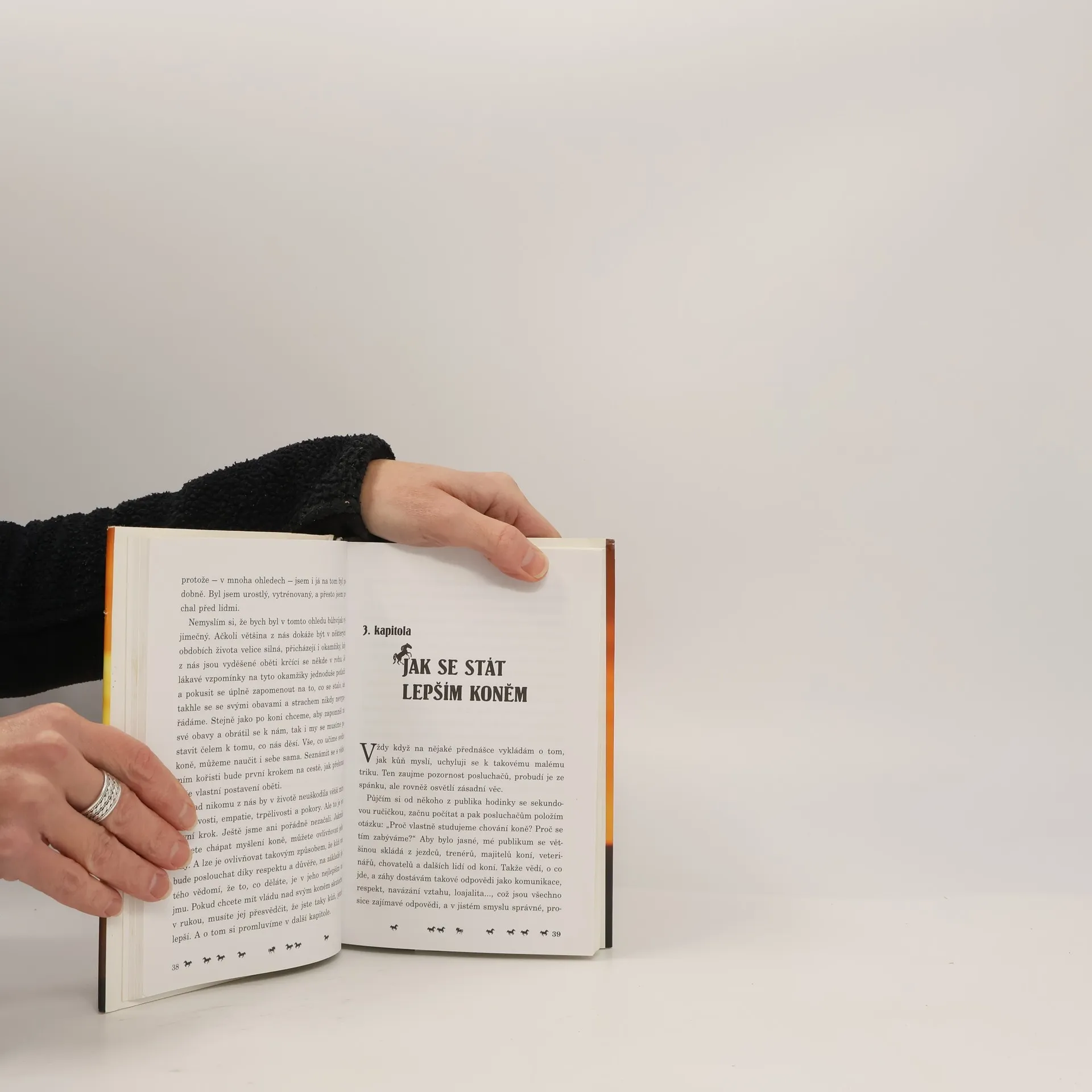Chris Irwin, známý kanadský „zaříkávač koní“ a profesionální trenér, strávil více než dvacet let prací s koňmi. Ve své objevné knize sdílí inspirativní a praktické rady, postřehy a příklady ze své bohaté zkušenosti. Představuje vlastní metodu nerezistenčního, tedy nenásilného výcviku koní. Po letech práce se stovkami koní odhalil tajemství komunikace s těmito zvířaty, umění naslouchat a efektivně je ovládat. Kůň vnímá svět jinak než člověk, a proto je důležité mluvit s ním jazykem, kterému rozumí. Porozuměním myšlení koně a jeho řeči těla můžeme ovlivnit jeho chování a získat nad ním kontrolu. Irwin, expert na psychologii koní, ukazuje jak začínajícím jezdcům, tak trenérům, majitelům koní a veterinářům, jak empaticky a trpělivě komunikovat, osvojit si vyváženost a sebejistotu při jízdě. Dále objasňuje účinky hipoterapie, která pomáhá lidem s různými problémy dosáhnout hlubokých změn ve svém životě prostřednictvím vztahu s koněm. Kniha končí dodatkem s podrobnými metodickými instrukcemi pro nerezistenční trénink koní.