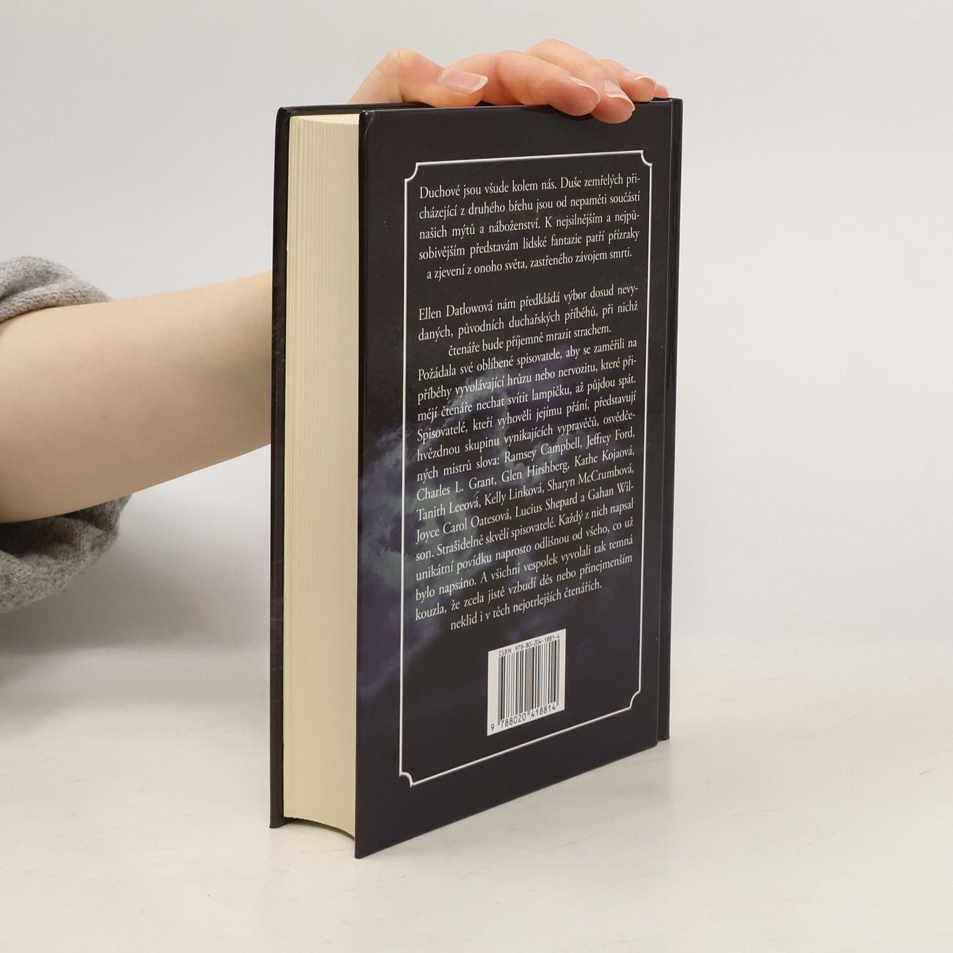 Duchové jsou všude kolem nás. Duše zemřelých přicházející z druhého břehu jsou od nepaměti součástí našich mýtů a náboženství. K nejsilnějším a nejpůsobivějším představám lidské fantazie patří přízraky a zjevení z onoho světa zastřeného závojem smrti. Ellen Datlowová nám předkládá výbor dosud nevydaných, původních duchařských příběhů, při nichž čtenáře bude příjemně mrazit strachem. Požádala své oblíbené spisovatele, aby se zaměřili na příběhy vyvolávající hrůzu nebo nervozitu, které přimějí čtenáře nechat svítit lampičku, až půjdou spát. Spisovatelé, kteří vyhověli jejímu přání, představují hvězdnou skupinu vynikajících vypravěčů, osvědčených mistrů slova: Ramsey Campbell, Jeffrey Ford, Charles L. Grant, Glen Hirshberg, Kathe Kojaová, Tanith Leeová, Kelly Linková, Sharyn McCrumbová, Joyce Carol Oatesová, Lucius Shephard a Gahan Wilson. Strašidelně skvělí spisovatelé. Každý z nich napsal unikátní povídku naprosto odlišnou od všeho, co už bylo napsáno. A všichni vespolek vyvolali tak temná kouzla, že zcela jistě vzbudí děs nebo přinejmenším neklid i v těch nejotrlejších čtenářích.