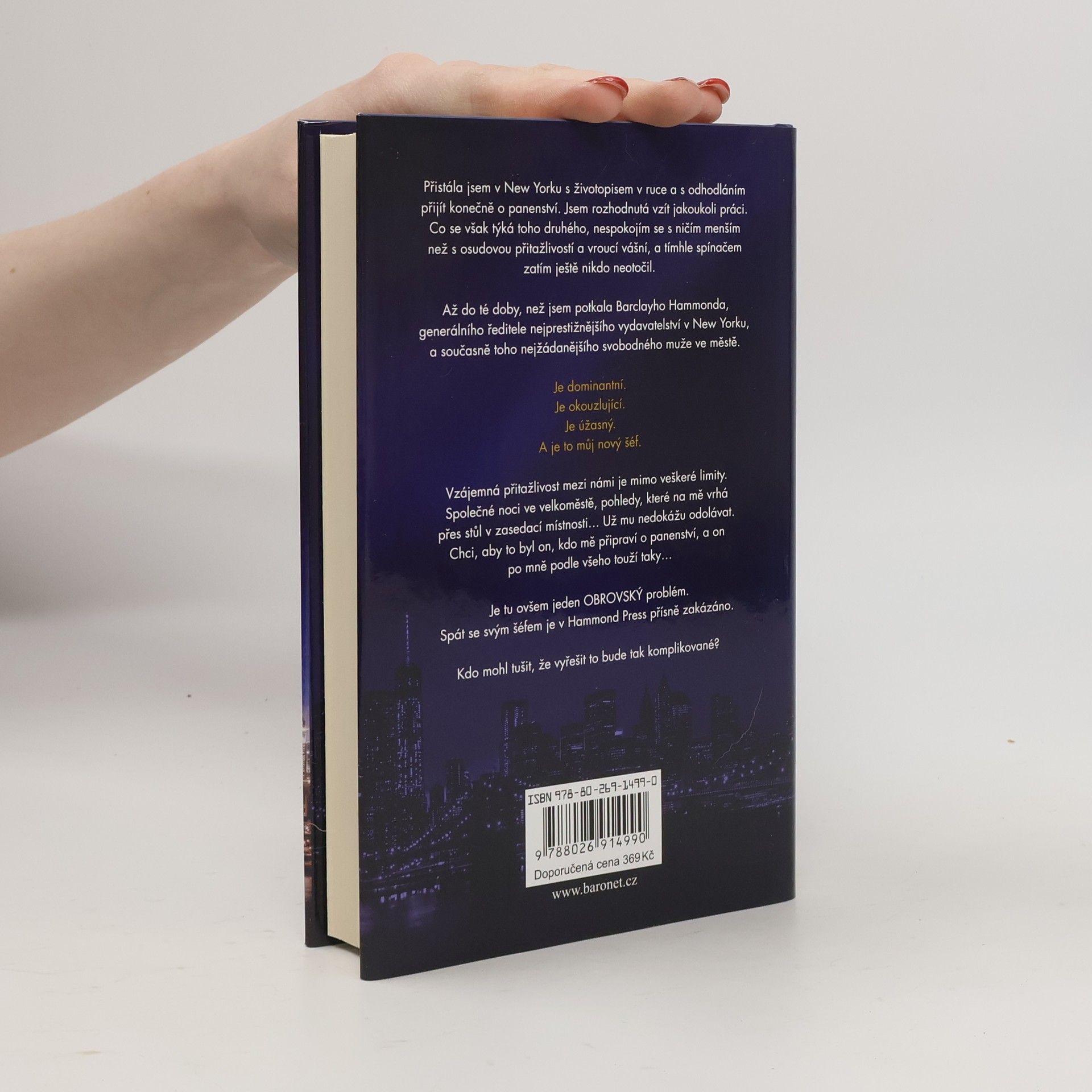 Přistála jsem v New Yorku s životopisem v ruce a odhodláním přijít konečně o panenství. Jsem rozhodnutá vzít jakoukoli práci. Co se však týká toho druhého, nespokojím se s ničím menším než s osudovou přitažlivostí a vroucí vášní, a tímhle spínačem zatím ještě nikdo neotočil. Až do té doby, než jsem potkala Barclayho Hammonda, generálního ředitele nejprestižnějšího vydavatelství v New Yorku, a současně toho nejžádanějšího svobodného muže ve městě. Je dominantní. Je okouzlující. Je úžasný. A je to můj nový šéf. Vzájemná přitažlivost mezi námi je mimo veškeré limity. Společné noci ve velkoměstě, pohledy, které na mě vrhá přes stůl v zasedací místnosti… Už mu nedokážu odolávat. Chci, aby to byl on, kdo mě připraví o panenství, a on mě podle všeho chce taky… Je tu ovšem jeden OBROVSKÝ problém. Spát se svým šéfem je v Hammond Press přísně zakázáno. Kdo mohl tušit, že vyřešit ho bude tak komplikované?