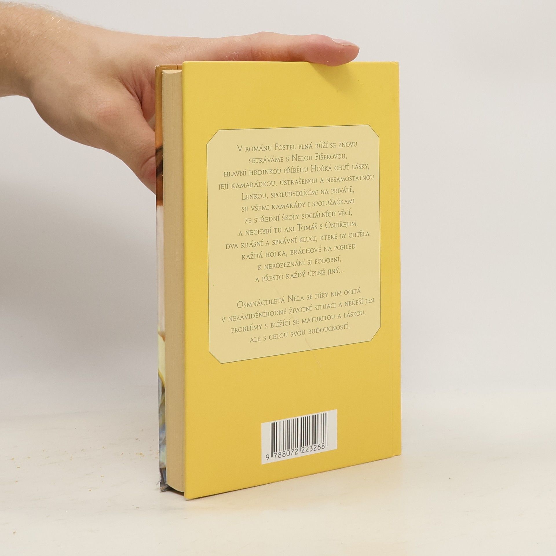 V románu POSTEL PLNÁ RŮŽÍ se znovu setkáváme s Nelou Fišerovou,hlavní hrdinkou příběhu HOŘKÁ CHUŤ LÁSKY, její kamarádkou, ustrašenoua nesamostatnou Lenkou, spolubydlícími na privátě, se všemi kamarády spolužačkami ze střední školy sociálních věcí, a nechybí tu ani Tomáš s Ondřejem, dva krásní a správní kluci, které by chtěla každá holka, bráchové na pohled k nerozeznání si podobní a přesto každý úplně jiný. Osmnáctiletá Nela se díky nim ocitá v nezáviděníhodné životní situaci a neřeší jen problémy s blížící se maturitou a láskou, ale s celou svou budoucností.