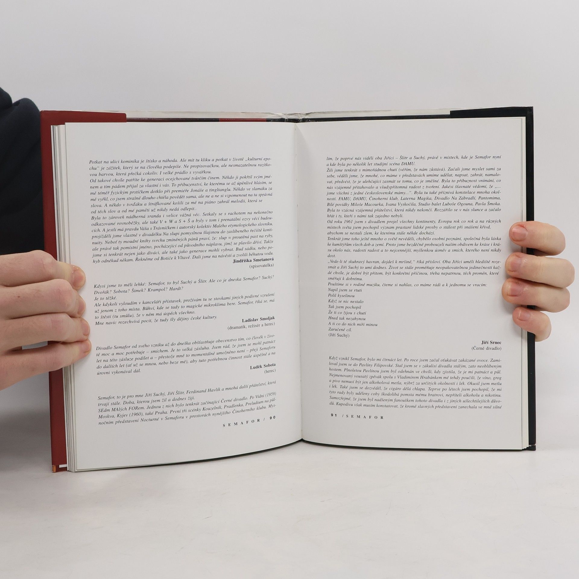 Divadlo Semafor a jeho čtyřicet roků se dřív či později stane určitě tématem dizertační práce či encyklopedie. My jsme ale - při práci na téhle knize - nemysleli na divadelní vědce, nýbrž na věrné diváky, kteří po čtyřicet sezón stáli fronty u pokladny, lapali melodie a slova nových písniček, těšili se na své hvězdy a vlídně přijímali nové talenty, smáli se a tleskali.... celý text