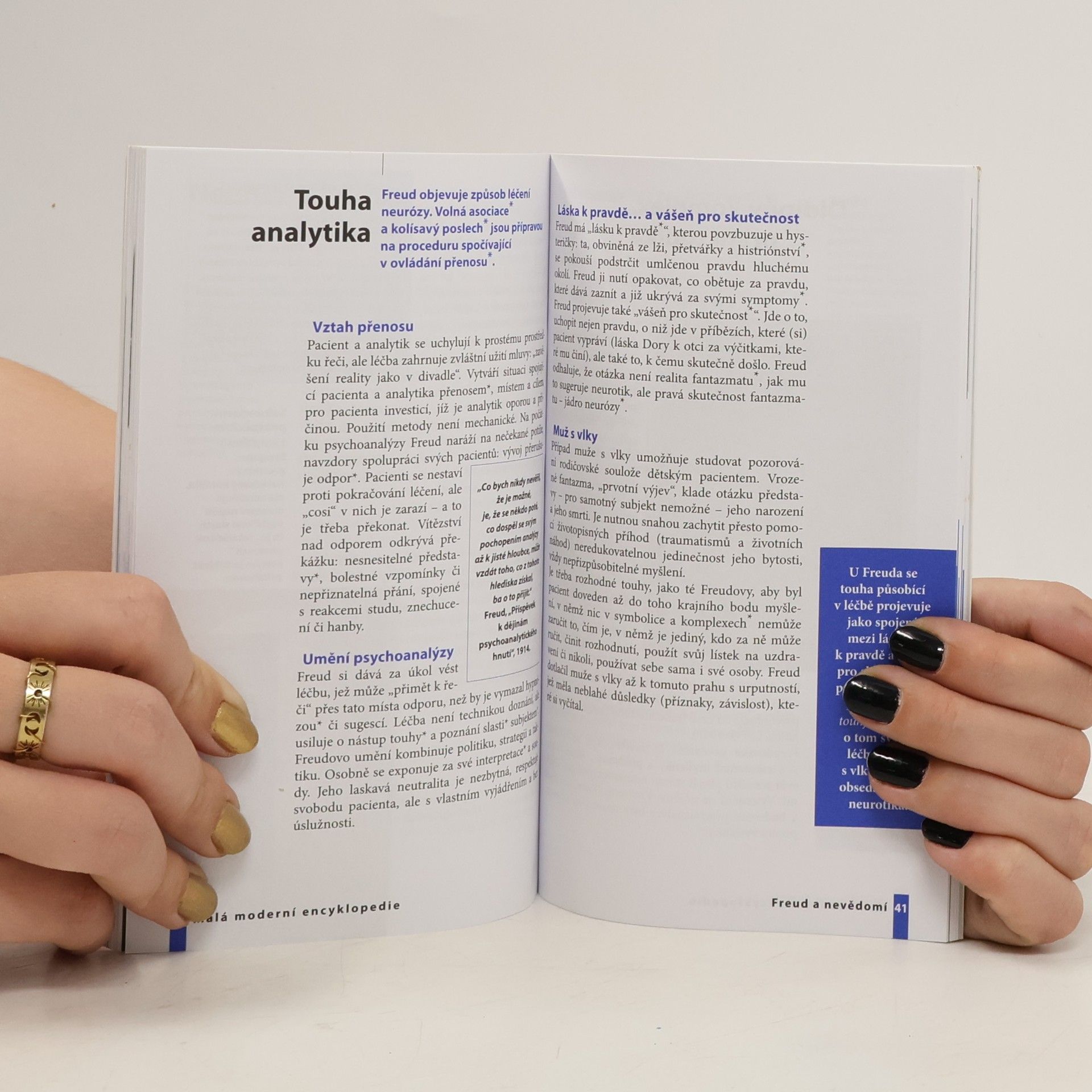 Freud si vzal z vlastního života materiál k psychoanalýze. Musel se opírat o nevšední touhu, aby prosadil svůj objev, udržel provozování léčby a předal psychoanalýzu živou. Dětská sexualita, nevědomí, přenos, opakování, pudy... pojmy psychoanalýzy celé století po jejím objevu dále čeří vodu v rybníku vědění a jsou neoddělitelné od ruky, která je uvedla ve známost. Toto dílo tvoří úzkou vazbu mezi životem a dílem "otce psychoanalýzy".