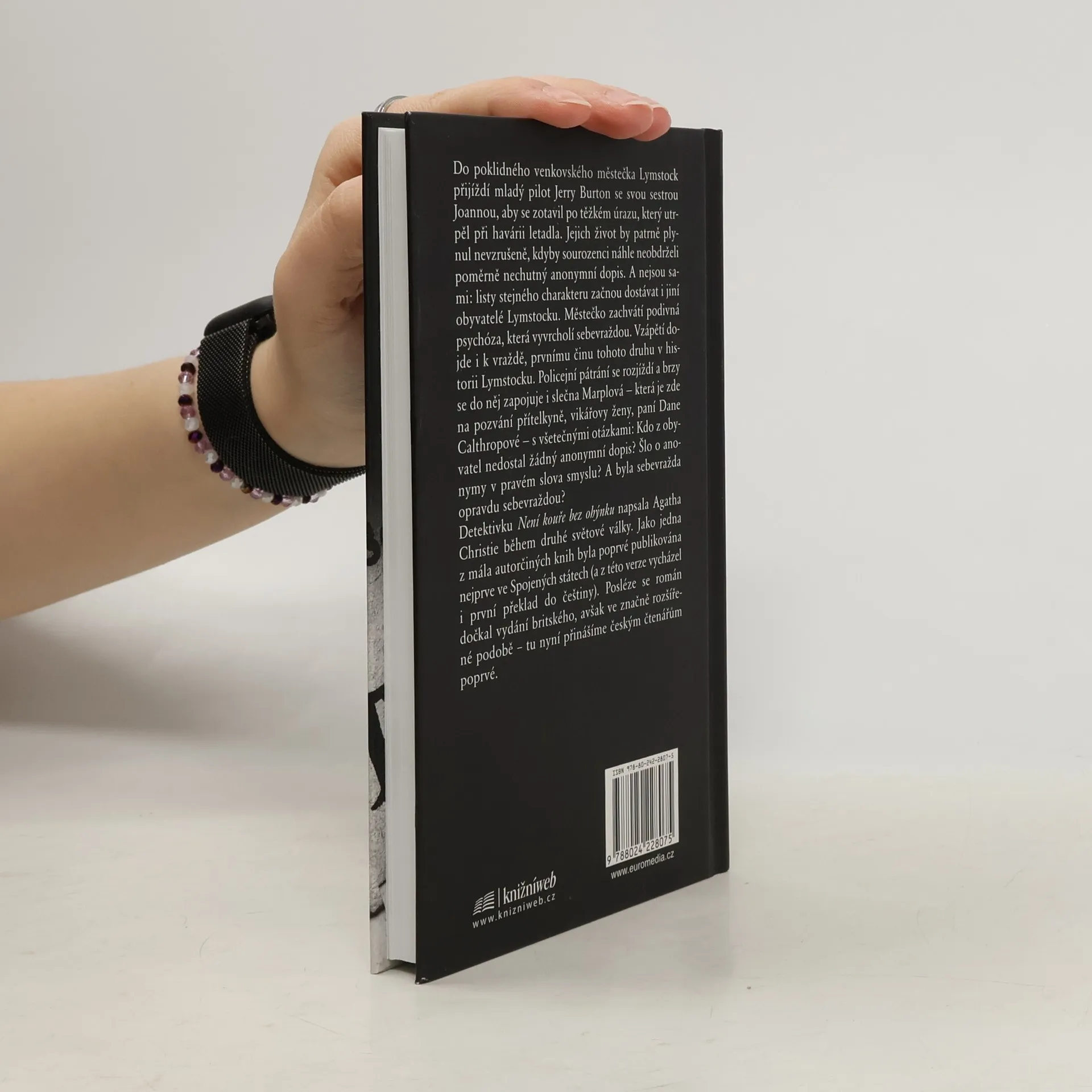 Mladý pilot Jerry Burton se v poklidném městečku Lymstock, opečováván svou sestrou Joannou, zotavuje po těžkém úrazu. Sourozenci však náhle obdrží poměrně nechutné anonymní dopisy. Ty začnou dostávat i jiní obyvatelé Lymstocku a městečko brzy zachvátí podivná psychóza, která vyvrcholí sebevraždou. A po ní následuje vražda. Policejní pátrání se rozjíždí a brzy se do případu zapojuje slečna Marplová se svými všetečnými otázkami… a neomylným čichem pro zločin a jeho pachatele. Román Není kouře bez ohýnku z roku 1942 byl jako jeden z mála detektivních příběhů Agathy Christie poprvé publikován v USA (z této verze vycházel i první překlad do češtiny). Teprve rok nato se dočkal vydání britského – a to ve značně rozšířené podobě, kterou nyní přinášíme českým čtenářům poprvé.