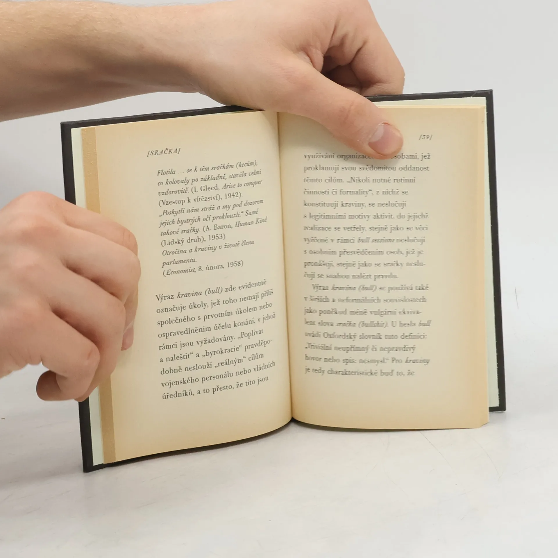 Je to vtip? Není to vtip? Každopádně je to dost vážné na to, aby se tahle knížka stala světovým bestsellerem… "Jednou z nejvýraznějších charakteristik naší kultury je skutečnost, že všude kolem nás se z různých úst line neskutečná spousta sraček," prohlašuje autor tohoto nevšedního díla a se vší vážností pokračuje: "Mým cílem je poskytnout obecný přehled o tom, co to sračka je a jak se odlišuje od toho, co sračka není - nebo (pokud si to přejete vyjádřit jinak) více či méně zevrubně definovat charakter obecného pojímání sraček." Jistě, můžeme to považovat za recesi, ale na to je text příliš seriózní, vývody příliš brilantní a záběr do historie, klasického dramatu, literatury i filozofie příliš široký. Nikdo neříká, že to není zábavné, ale při vší nesporné zábavnosti, je to dostatečně "vědecké" na to, abychom se nad tím zamysleli.