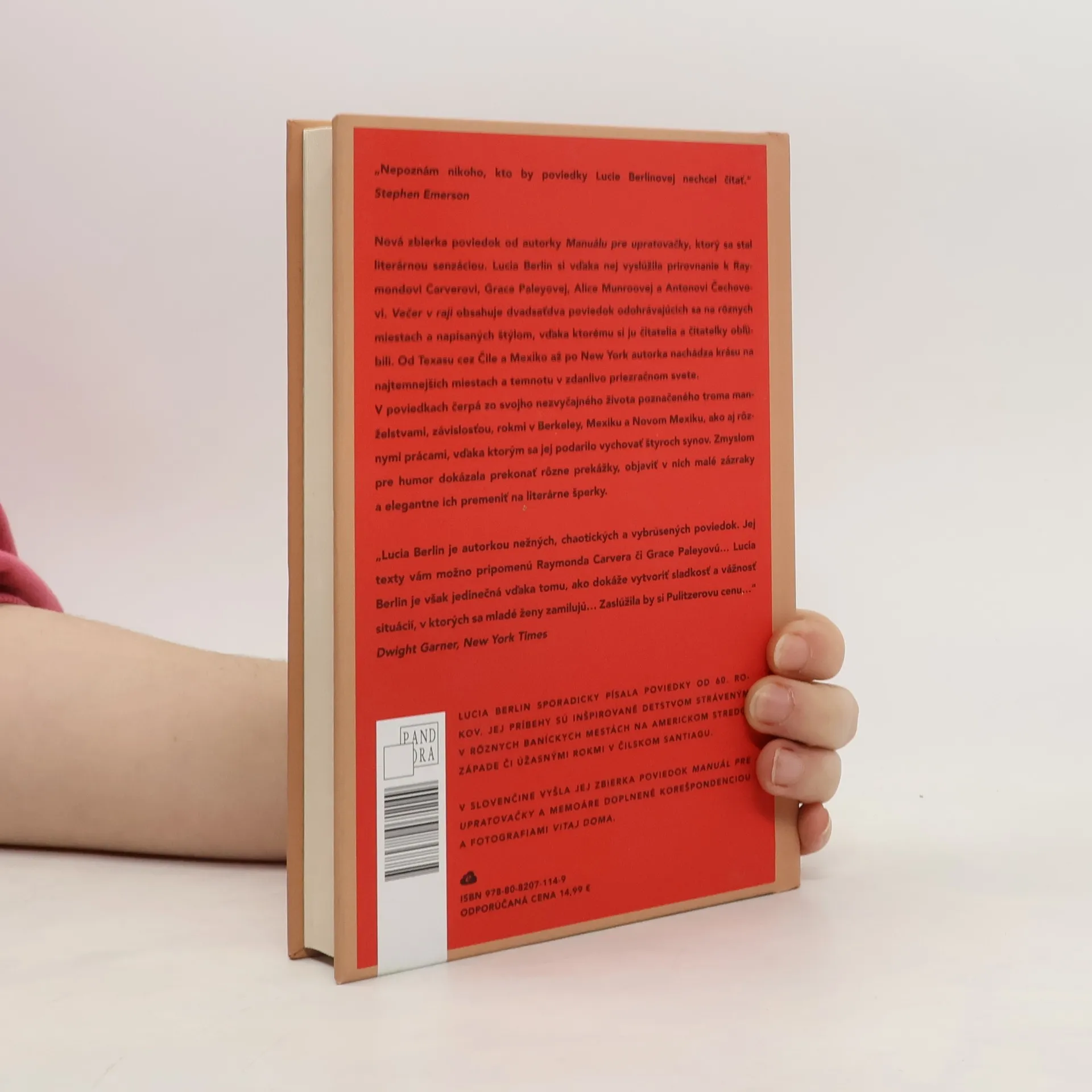 Nová zbierka poviedok americkej spisovateľky Lucie Berlinovej, ktorej posmrtne vydaná zbierka s názvom Manuál pre upratovačky sa stala literárnou senzáciou. Autorka si vďaka nej vyslúžila prirovnanie k Raymondovi Carverovi, Grace Paleyovej, Alice Munrovej a Antonovi Čechovovi. Večer v raji obsahuje ďalších dvadsaťdva poviedok vo svete a štýle, pre ktorí si ju čitatelia a čitateľky obľúbili. Od Texasu cez Čile, Mexiko až do New Yorku autorka nachádza krásu na najtemnejších miestach a temnotu v zdanlivo priezračnom. Večer v raji predstavuje kľúčovú súčasť Berlinovej diela, šperkovničku s čitateľskými drahými kameňmi.