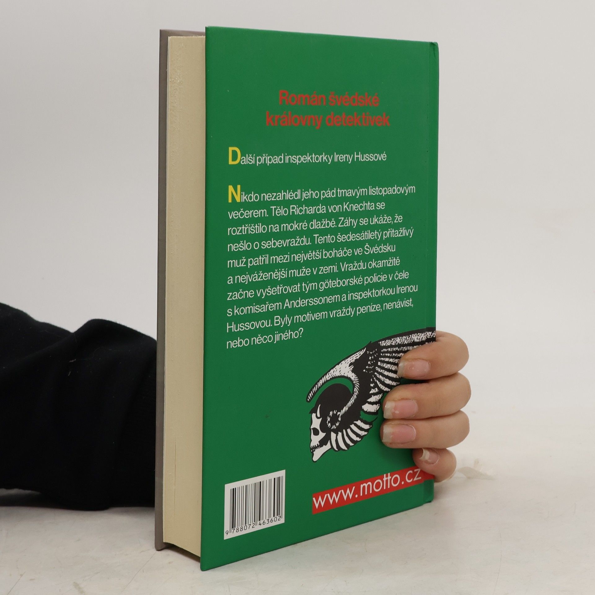 Román švédské královny detektivek. Další případ inspektorky Ireny Hussové. Nikdo nezahlédl jeho pád tmavým listopadovým večerem. Tělo Richarda von Knechta se roztříštilo na mokré dlažbě. Záhy se ukáže, že nešlo o sebevraždu. Tento šedesátiletý přitažlivý muž patřil mezi největší boháče ve Švédsku a nejváženější muže v zemi. Vraždu okamžitě začne vyšetřovat tým göteborské policie v čele s komisařem Anderssonem a inspektorkou Irenou Hussovou. Byly motivem vraždy peníze, nenávist, nebo něco jiného?