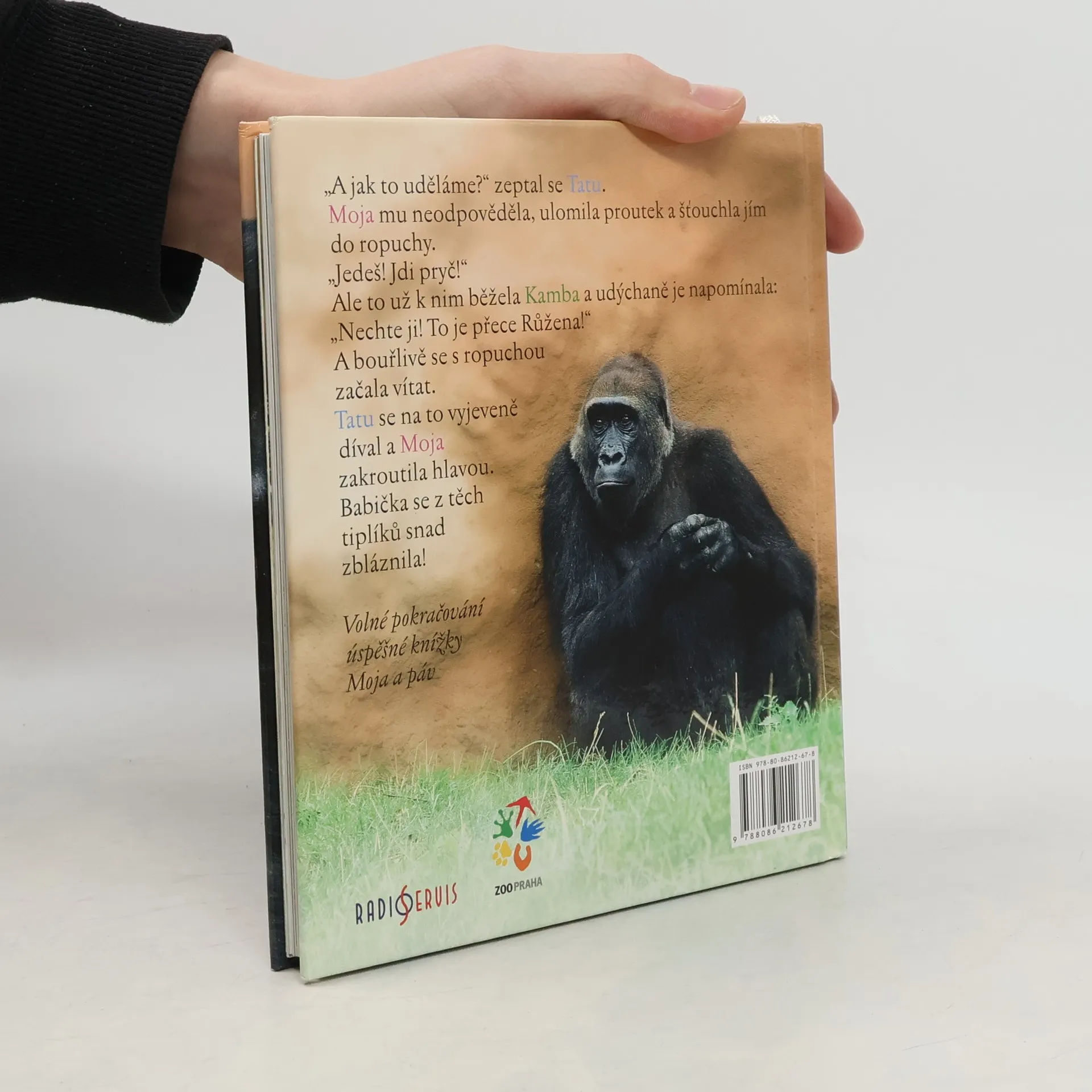 Napínavé i humorné příběhy slavné gorilky Moji a jejího mladšího brášky Tatua. Texty autora projektu Odhalení Miroslava Bobka a scénáristky Terezy Šefrnové volně navazují na jejich předchozí úspěšnou knížku Moja a páv. Doplněno mnoha celostránkovými fotografiemi a obsáhlým doslovem pro zvídavé děti i dospělé.