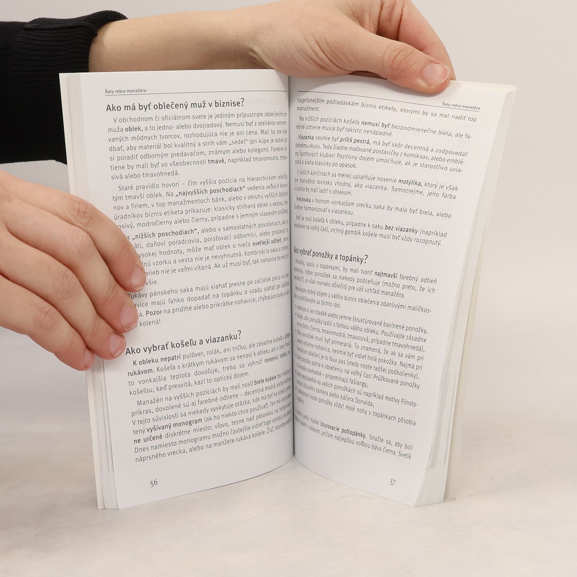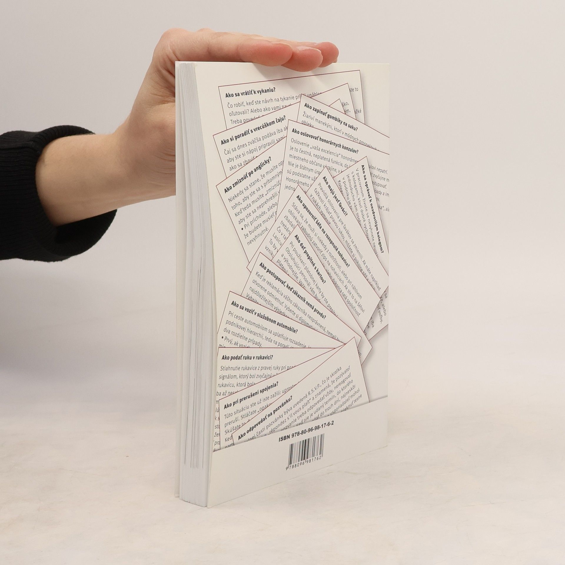 Biznis etiketa sa v školách nevyučuje, hoci je preukázané, že imidž spoločnosti, podniku či firmy dnes viac ako kedykoľvek predtým určuje správanie sa jeho pracovníkov. A to tak medzi sebou, ako aj voči zákazníkom či obchodným partnerom. Nie sú to len výrobky, alebo výkony, ktoré vytvárajú „tvár“ podniku, ale čoraz viac ľudia. Kto pravidlá biznis etikety neovláda, mal by sa ich doučiť. Vedieť sa primerane správať v každej situácii je profesionálne, nevyžaduje si mimoriadne náklady, no čoraz viac sa stáva kľúčom k úspechu. V úvode knižky sa nachádza test, v ktorom čitateľ môže zistiť, či sa vie správať podľa pravidiel biznis etikety, či sa s istotou dokáže pohybovať na klzkom parkete obchodnej kultúry a či má jeho komunikácia s obchodnými partnermi, ako aj kolegami, požadovanú úroveň. Otázky a odpovede v knižke sú rozdelené do 23 kapitol