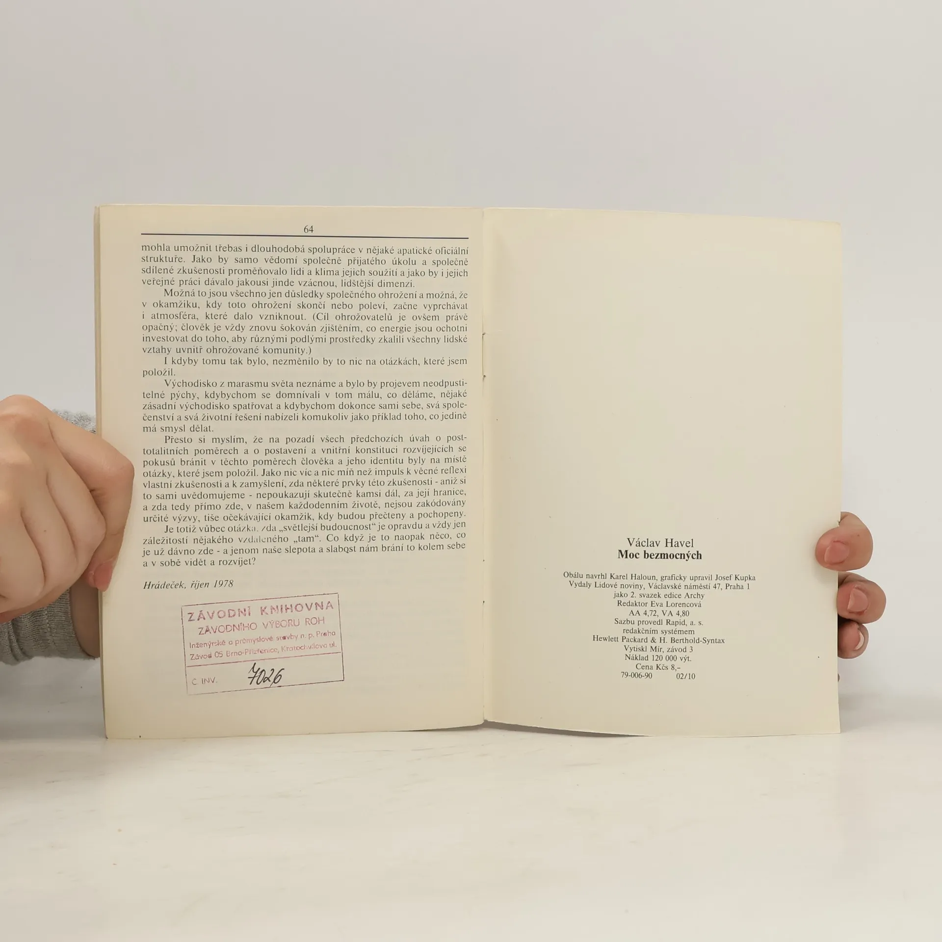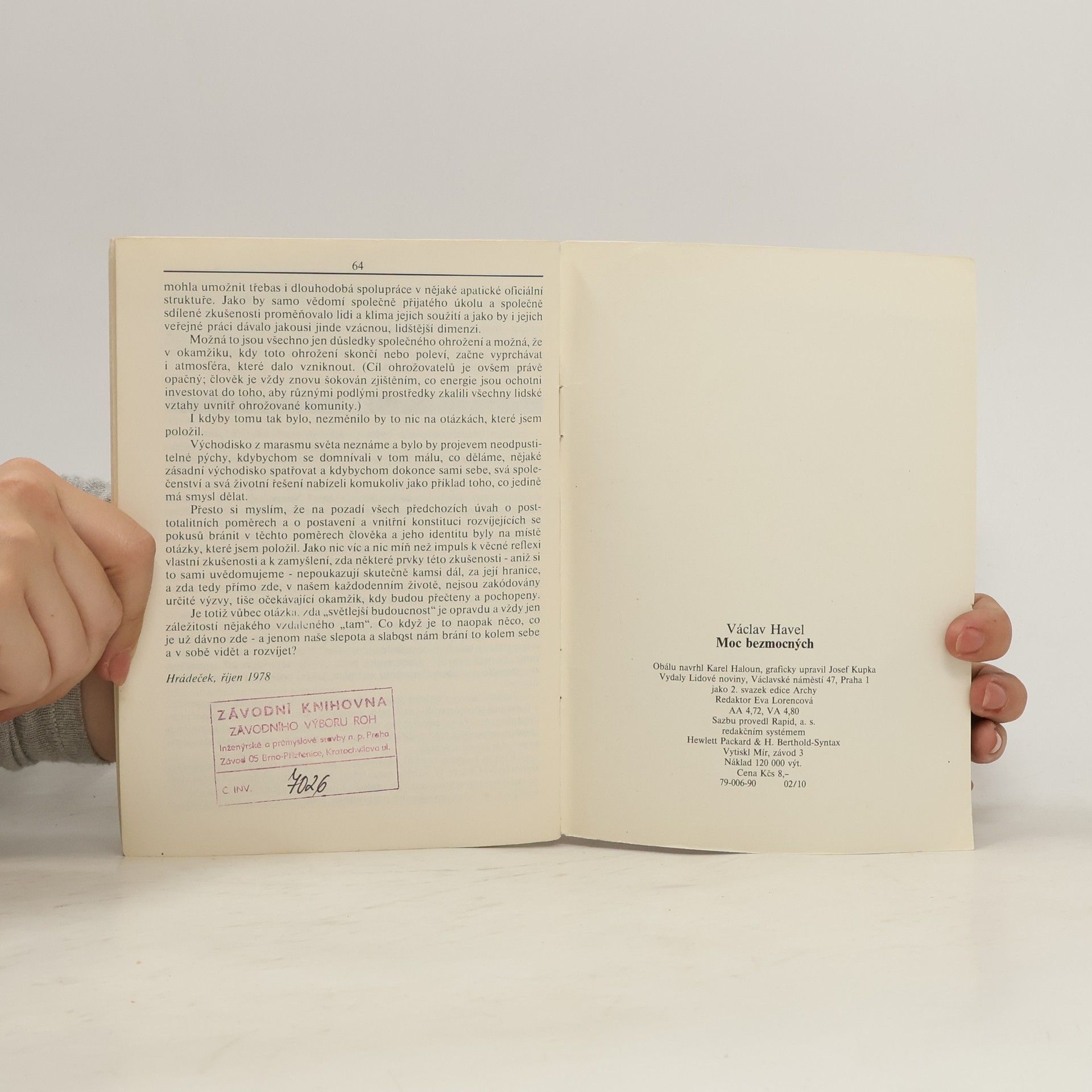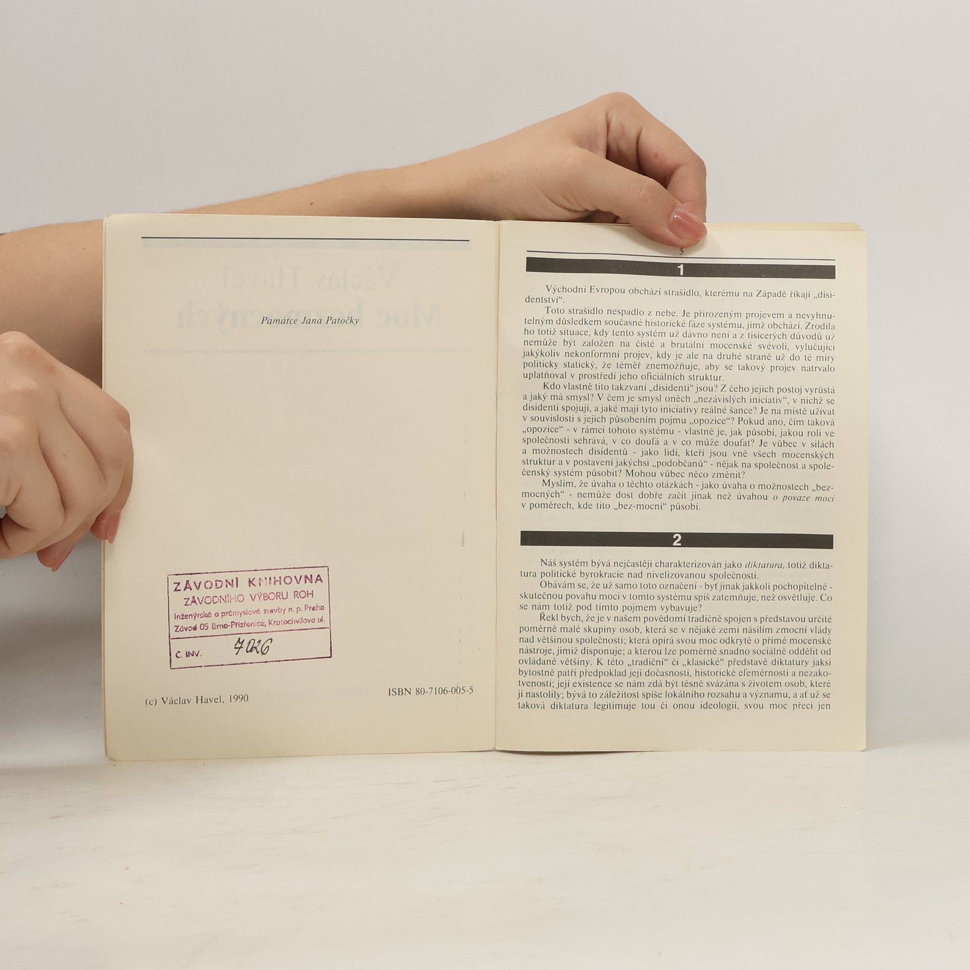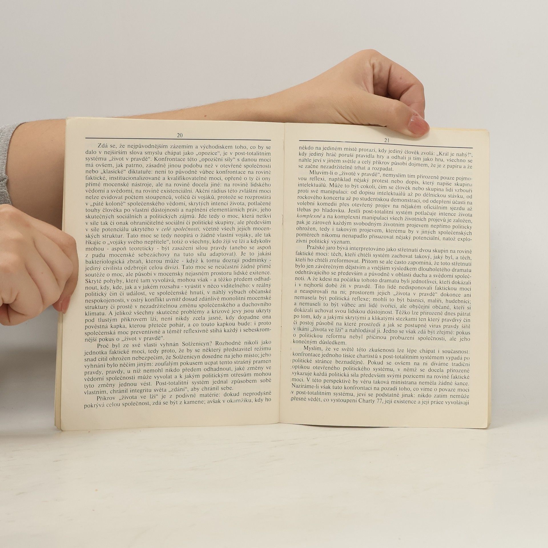 Esej bývalého českého prezidenta, spisovatele a dramatika Václava Havla, poprvé vydaná roku 1989 nakladatelstvím Host. Havel v ní popisuje fenomén disidentství v post-totalitních režimech. Pojmenovává ho "moc bezmocných", což naznačuje úsilí disidentů konat společenská a politická rozhodnutí, ale nezakládat přitom svou moc na instituci státu. Autor také poukazuje na působení ideologie skrze obyčejný lid, který se následně nevědomky stává nástrojem k opakovaném uplatňování a utvrzování totalitní moci. Esej je věnovaná filosofu Janu Patočkovi, na kterého Havel odkazuje návrhem vlastního politického programu, který nazývá "ivot v pravdě". Mimo něj Havel odkazuje i na řadu dalších filosofů, např. Heideggera, a rozebírá mnoho socio-politických konceptů. Podnětná esej od jednoho z nejvýraznějších českých intelektuálů, která si zaslouží pozornost i dnes.