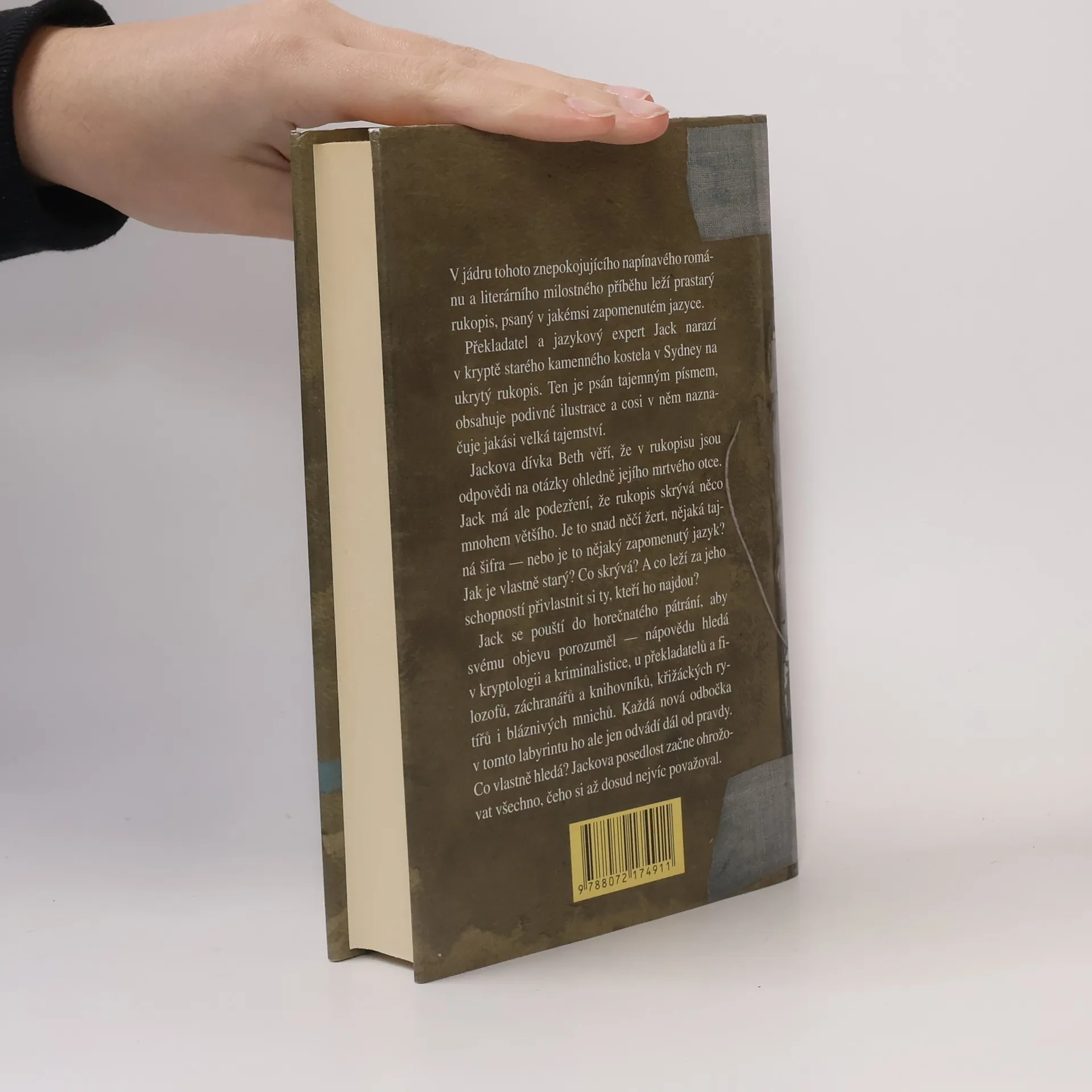 V jádru tohoto znepokojujícího napínavého románu a literárního milostného příběhu leží prastarý rukopis, psaný v jakémsi zapomenutém jazyce… Překladatel a jazykový expert Jack narazí v kryptě starého kamenného kostela v Sydney na ukrytý rukopis. Ten je psán tajemným písmem, obsahuje podivné ilustrace, a cosi v něm naznačuje jakási velká tajemství. Beth, dívka, se kterou Jack chodí, věří, že tento rukopis obsahuje odpovědi na otázky ohledně jejího mrtvého otce. Jack má ale podezření, že rukopis skrývá něco mnohem většího. Je to snad něčí žertík, nějaký tajný kód – nebo je to nějaký zapomenutý jazyk? Jak je vlastně starý? Co vlastně skrývá? A co leží za jeho schopností přivlastnit si ty, kteří ho najdou? Jack se pouští do horečnatého pátrání, aby svému objevu porozuměl – nápovědu hledá v kryptologii a soudním lékařství, u překladatelů a filosofů, záchranářů a knihovníků, křižáckých rytířů i bláznivých mnichů. Každá nová odbočka v tomto labyrintu ho ale jen odvádí dál od pravdy. Co vlastně hledá? Jackova posedlost začne ohrožovat všechno, čeho si až dosud nejvíc považoval
