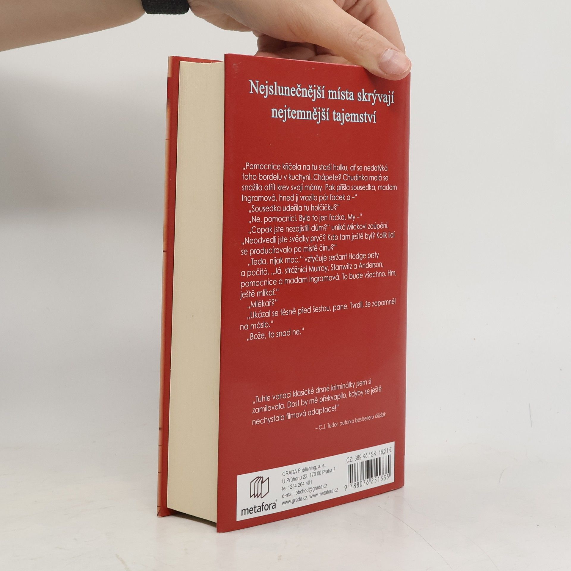 Spletitý detektivní příběh vetknutý přímo do srdce amerického snu Včera jsem svého manžela políbila naposledy… Je léto roku 1959 a perfektně zastřižené trávníky kalifornského Sunnylakes vadnou pod horkým sluncem. Někdy během jednoho nekonečně dlouhého odpoledne zmizí z domova Joyce Haneyová, manželka a matka, a nechá za sebou jen dvě vyděšené děti a krvavou skvrnu na podlaze v kuchyni. Sousedé Haneyových jsou událostí zděšeni. Dělají, co mohou, organizují pátrací skupiny a pokouší se Joyce najít. Klíč ke znepokojivé záhadě, která otřásla základy jejich amerického snu, ale drží někdo jiný. Někdo, kdo by jimi v očích sunnylakeských obyvatel mohl otřást ještě víc. Ruby Wrightová, černá pomocnice v domě Haneyových, která k nim dojíždí z chudinského ghetta, ví, že nic není tak, jak se na první pohled zdá. Všichni ti přátelští lidé, žijící v krásných domech, tajně vyhlížející zpoza naškrobených záclon, mají tajemství. A ona o těch tajemstvích ví víc než kdokoliv jiný. I proto netrvá dlouho, než ji detektiv Mick Blank, řídící vyšetřování, požádá o pomoc. Co ho to ale bude stát? A jakou cenu zaplatí ona, pokud na jeho žádost kývne? Během nekonečně dlouhých horkých odpolední, vřících klamem, nedůvěrou a předsudky, stačí jediná jiskra, aby dokonalý sunnylakeský sen lehl popelem.