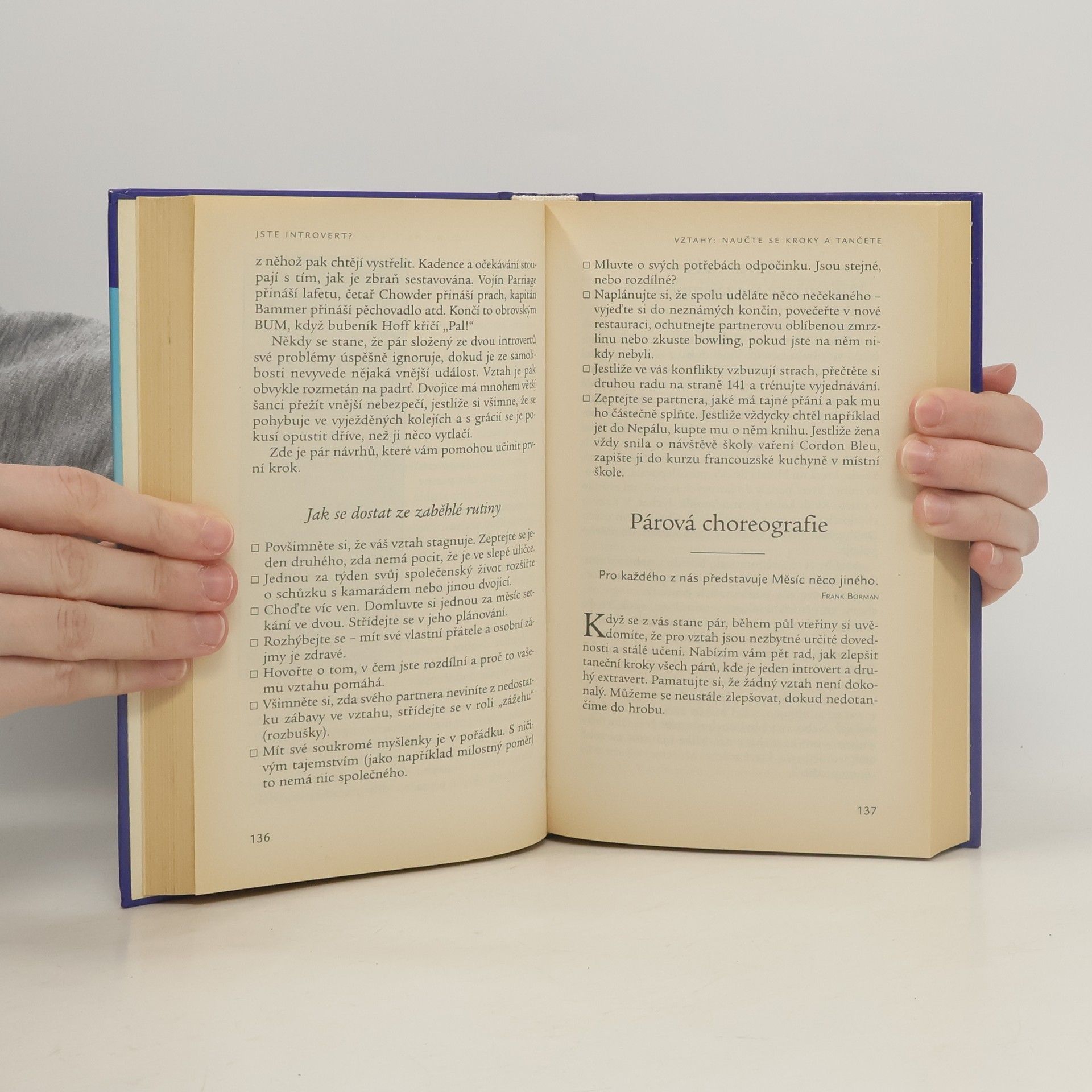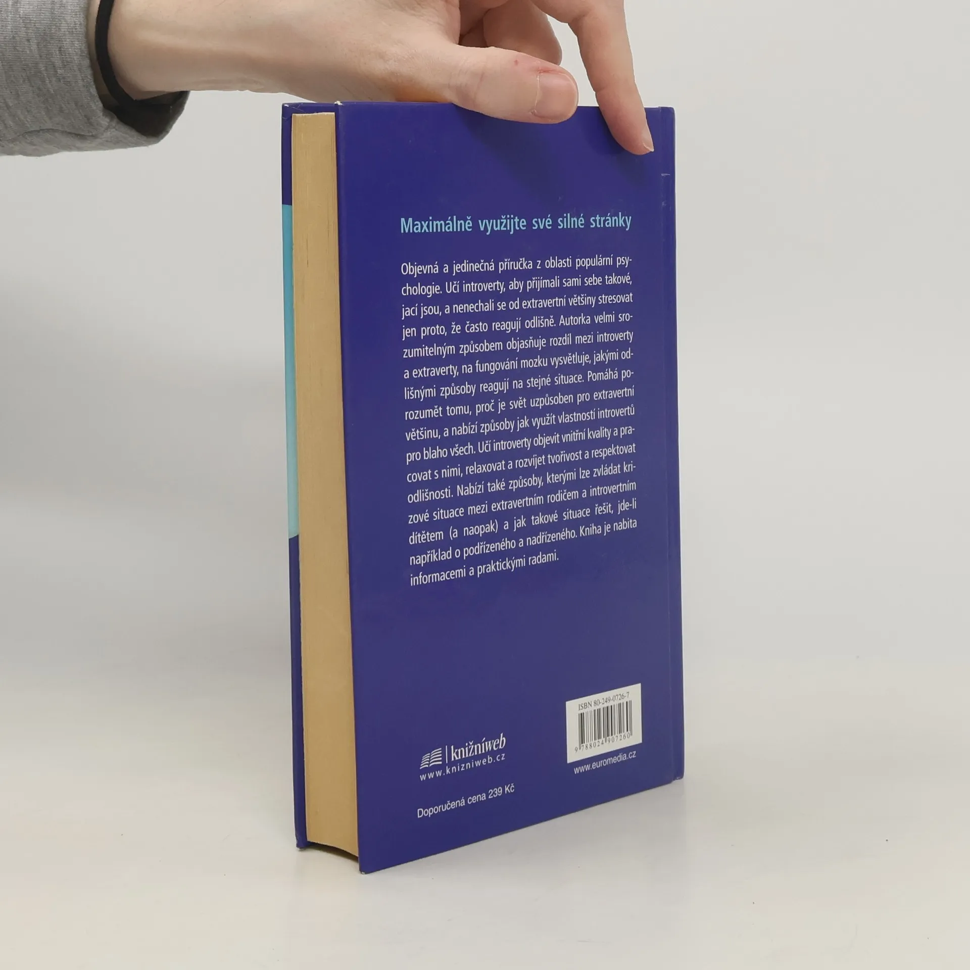 Maximálně využijte své silné stránky. Objevná a jedinečná příručka z oblasti populární psychologie. Učí introverty, aby přijímali sami sebe takové, jací jsou, a nenechali se od extravertní většiny stresovat jen proto, že často reagují odlišně. Autorka velmi srozumitelným způsobem objasňuje rozdíl mezi introverty a extraverty, na fungování mozku vysvětluje, jakými odlišnými způsoby reagují na stejné situace. Pomáhá porozumět tomu, proč je svět uzpůsoben pro extravertní většinu, a nabízí způsoby jak využít vlastností introvertů pro blaho všech. Učí introverty objevit vnitřní kvality a pracovat s nimi, relaxovat a rozvíjet tvořivost a respektovat odlišnosti. Nabízí také způsoby, kterými lze zvládat krizové situace mezi extravertním rodičem a introvertním dítětem (a naopak) a jak takové situace řešit, jde-li například o podřízeného a nadřízeného. Kniha je nabita informacemi a praktickými radami.