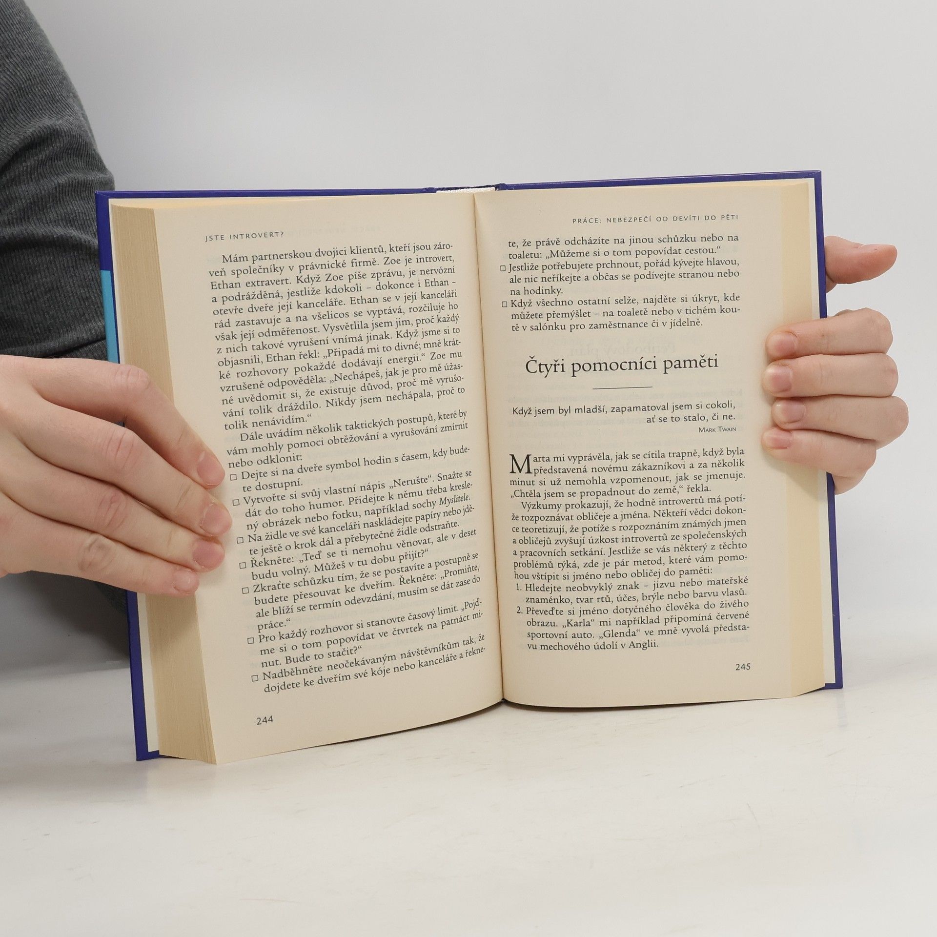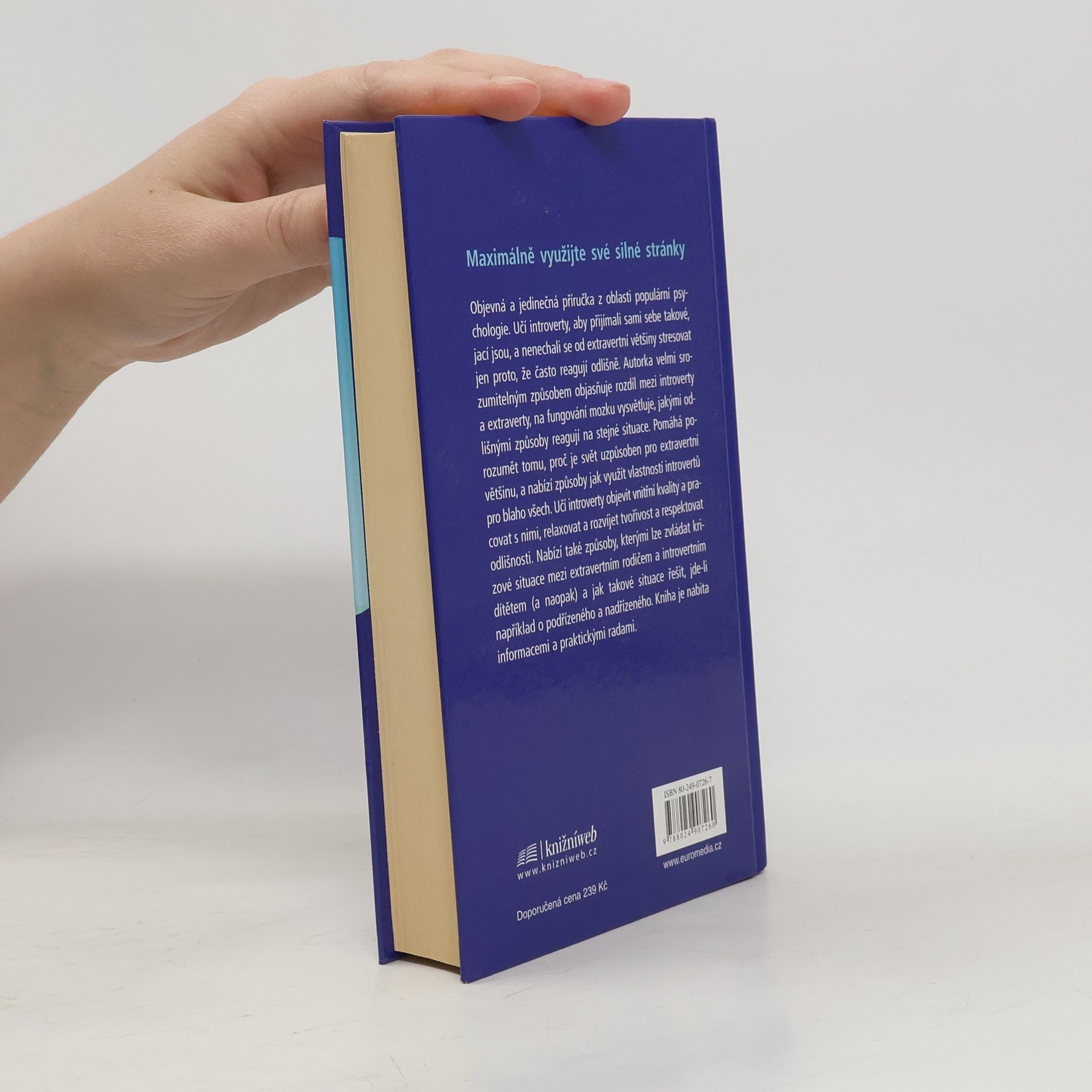 Maximálně využijte své silné stránky. Objevná a jedinečná příručka z oblasti populární psychologie. Učí introverty, aby přijímali sami sebe takové, jací jsou, a nenechali se od extravertní většiny stresovat jen proto, že často reagují odlišně. Autorka velmi srozumitelným způsobem objasňuje rozdíl mezi introverty a extraverty, na fungování mozku vysvětluje, jakými odlišnými způsoby reagují na stejné situace. Pomáhá porozumět tomu, proč je svět uzpůsoben pro extravertní většinu, a nabízí způsoby jak využít vlastností introvertů pro blaho všech. Učí introverty objevit vnitřní kvality a pracovat s nimi, relaxovat a rozvíjet tvořivost a respektovat odlišnosti. Nabízí také způsoby, kterými lze zvládat krizové situace mezi extravertním rodičem a introvertním dítětem (a naopak) a jak takové situace řešit, jde-li například o podřízeného a nadřízeného. Kniha je nabita informacemi a praktickými radami.