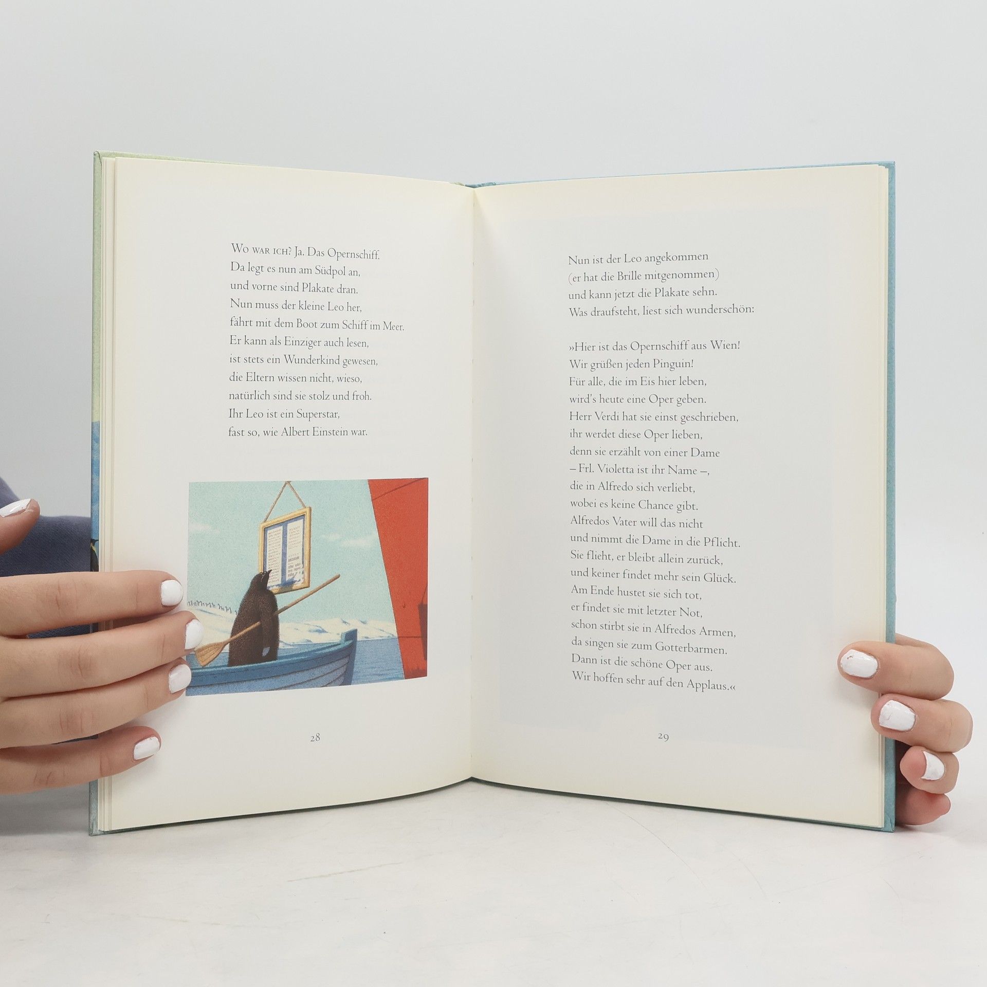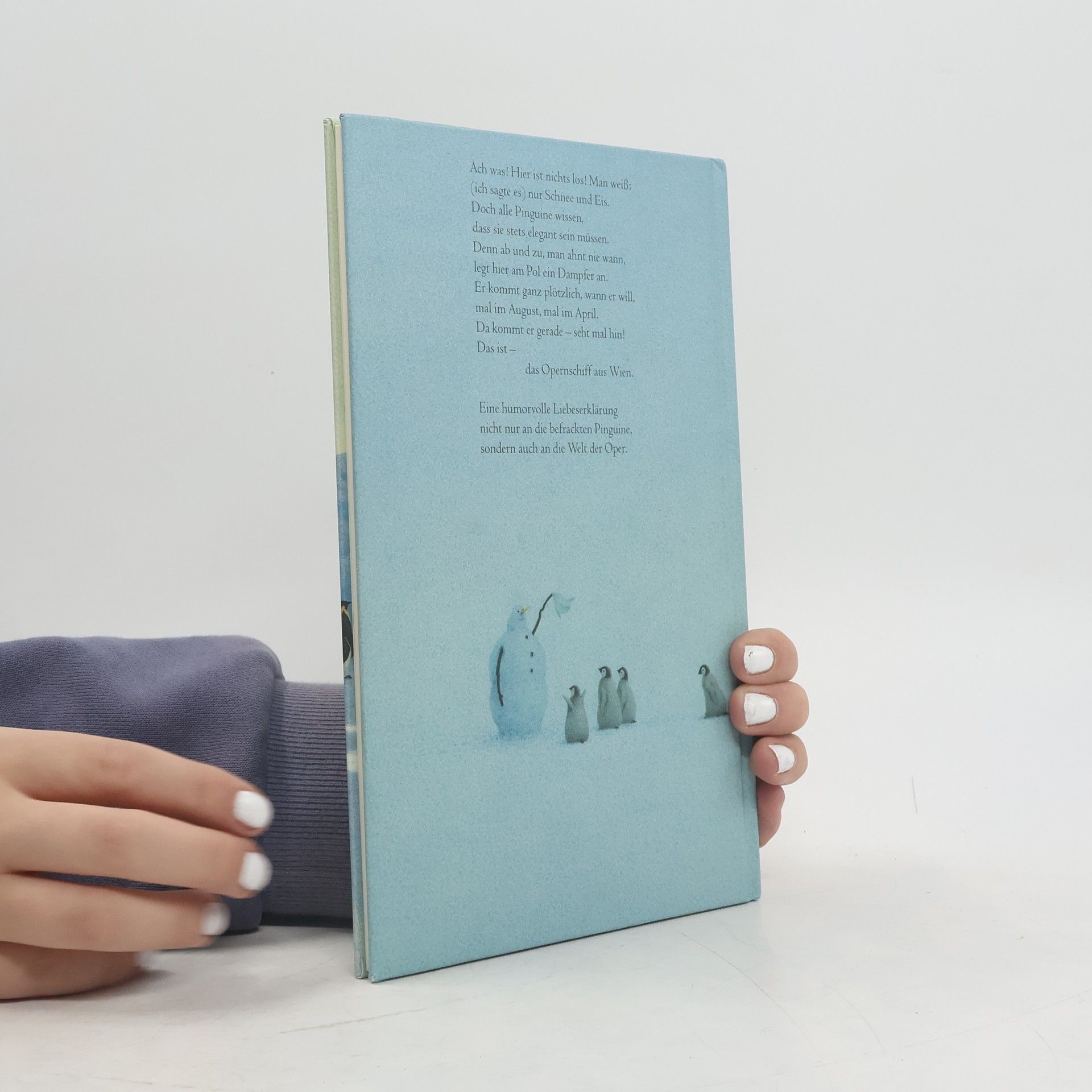 Am Südpol stehen sich die Pinguine die Beine in den Bauch. Geduldig harren sie der Dinge, die da kommen werden, und sie sind immer perfekt im Frack. Worauf sie warten? Elke Heidenreich hat es Gott sei Dank herausgefunden: Nicht allzu oft, doch dann und wann, kommt das Opernschiff aus Wien und lädt die Pinguine zur großen Operngala an Bord. Für diesen Tag wollen sie jederzeit gerüstet sein. Was diesmal wohl gespielt wird? Wer dieses Mal wohl singt? Man glaubt es kaum, die drei Tenöre. Und wenn sie »La Traviata« trällern, wird selbst den unterkühlten Pinguinen ganz heiß - aber auch nach der Vorstellung stehen sie so adrett da wie immer!