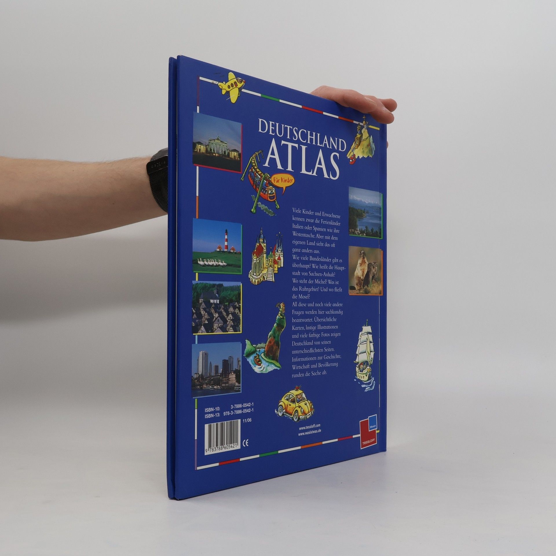 Wie viele Bundesländer gibt es? Wie heißt die Hauptstadt von Sachsen-Anhalt? Wo steht der Michel? Übersichtliche Karten, lustige Illustrationen und viele farbige Fotos zeigen Deutschland von unterschiedlichen Seiten. Daneben liefert der Atlas Informationen über die wichtigsten Seen, Flüsse und Berge, über Geschichte und Natur.