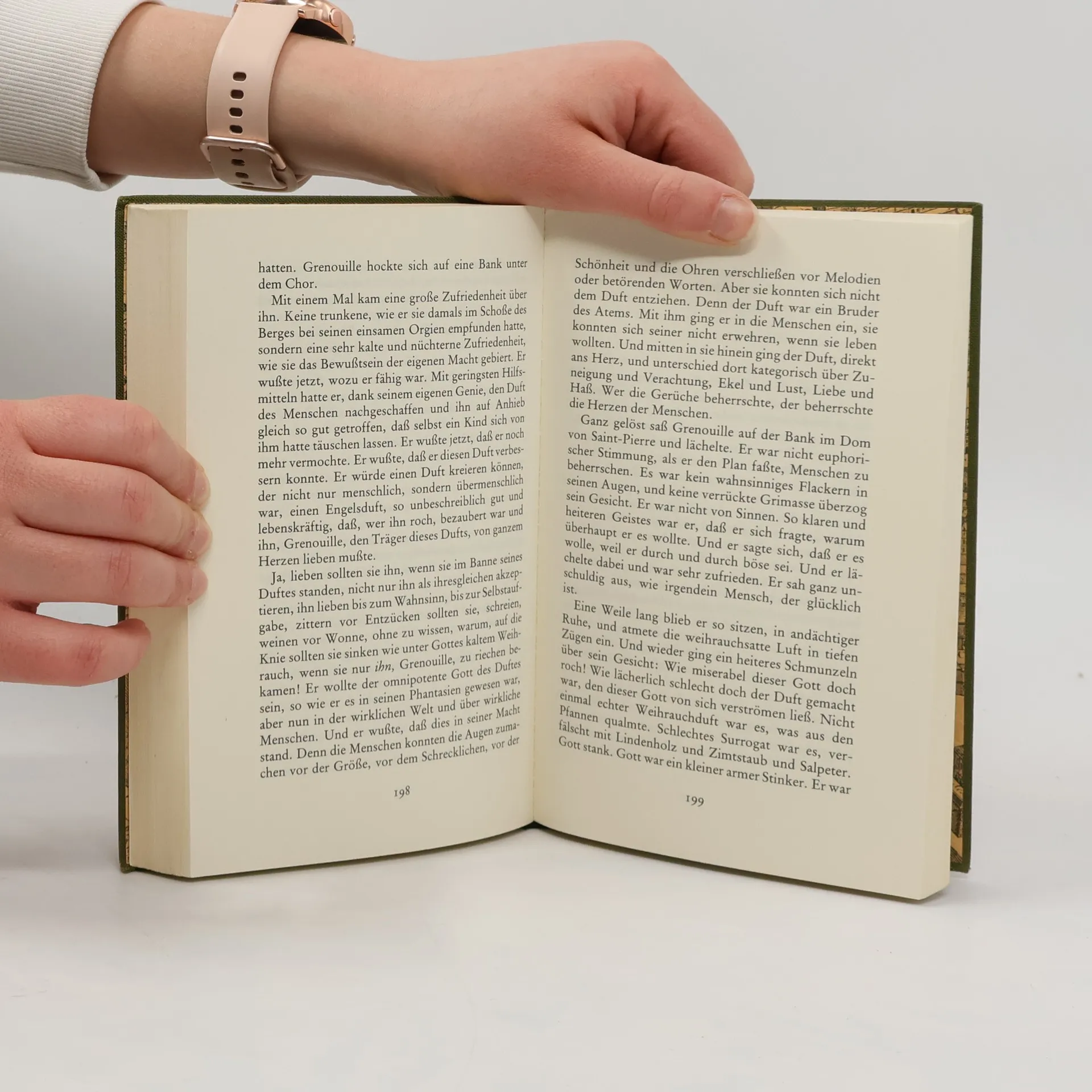 »Von Jean-Baptiste Grenouille, dem finsteren Helden, sei nur verraten, daß er am 17.Juli 1738 in Paris, in einer stinkigen Fischbude geboren wird. Die Ammen, denen das Kerlchen an die Brust gelegt wird, halten es nur ein paar Tage mit ihm aus: Er sei zu gierig, außerdem vom Teufel besessen, wofür es untrügliche Indizien gebe: den fehlenden Duft, den unverwechselbaren Geruch, den Säuglinge auszuströmen pflegen. Eine wundersame Eigenschaft, zu der sich alsbald andere dazugesellen... Wir beginnen zu ahnen, was es mit Grenouille auf sich haben könnte, fangen an, ihn leibhaftig vor uns zu sehen, folgen ihm in gemessenem Abstand auf seinen Wegen durch die dunkelsten Gassen von Paris, schauen zu, wie er dem Parfumeur Baldini zur Hand geht - und müssen uns eingestehen, die Phantasie, den Sprachwitz, den nicht anders als ungeheuerlich zu nennenden erzählerischen Elan Süskinds weit unterschätzt zu haben: so überraschend geht es zu in seinem Buch, so märchenhaft mitunter und zugleich so fürchterlich angsteinflößend.« -- Franz Josef Görtz (FAZ)