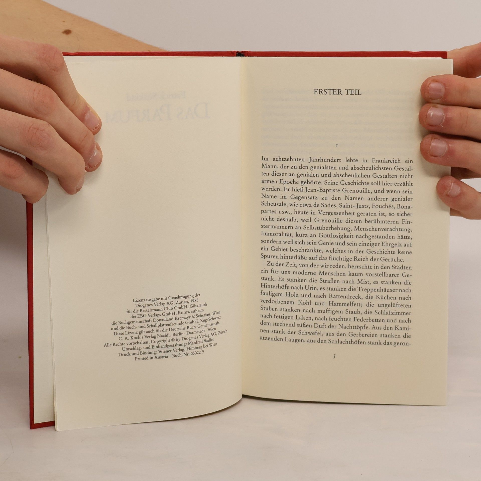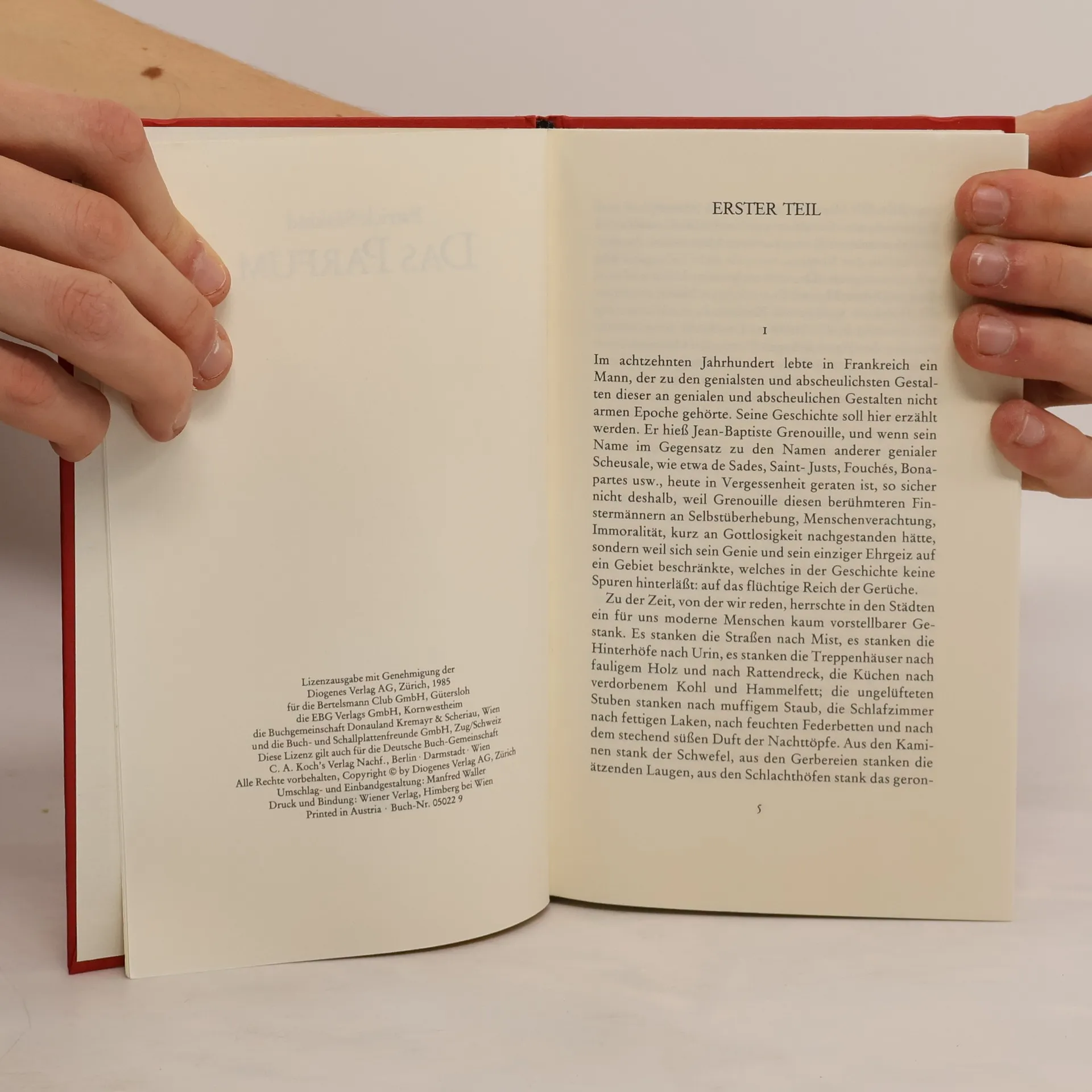 'Von Jean-Baptiste Grenouille, dem finsteren Helden, sei nur verraten, daß er 1738 in Paris, in einer stinkigen Fischbude, geboren wird. Die Ammen, denen das Kerlchen an die Brust gelegt wird, halten es nur ein paar Tage mit ihm aus: Er sei zu gierig, außerdem vom Teufel besessen, wofür es untrügliche Indizien gebe: den fehlenden Duft, den unverwechselbaren Geruch, den Säuglinge auszuströmen pflegen.'