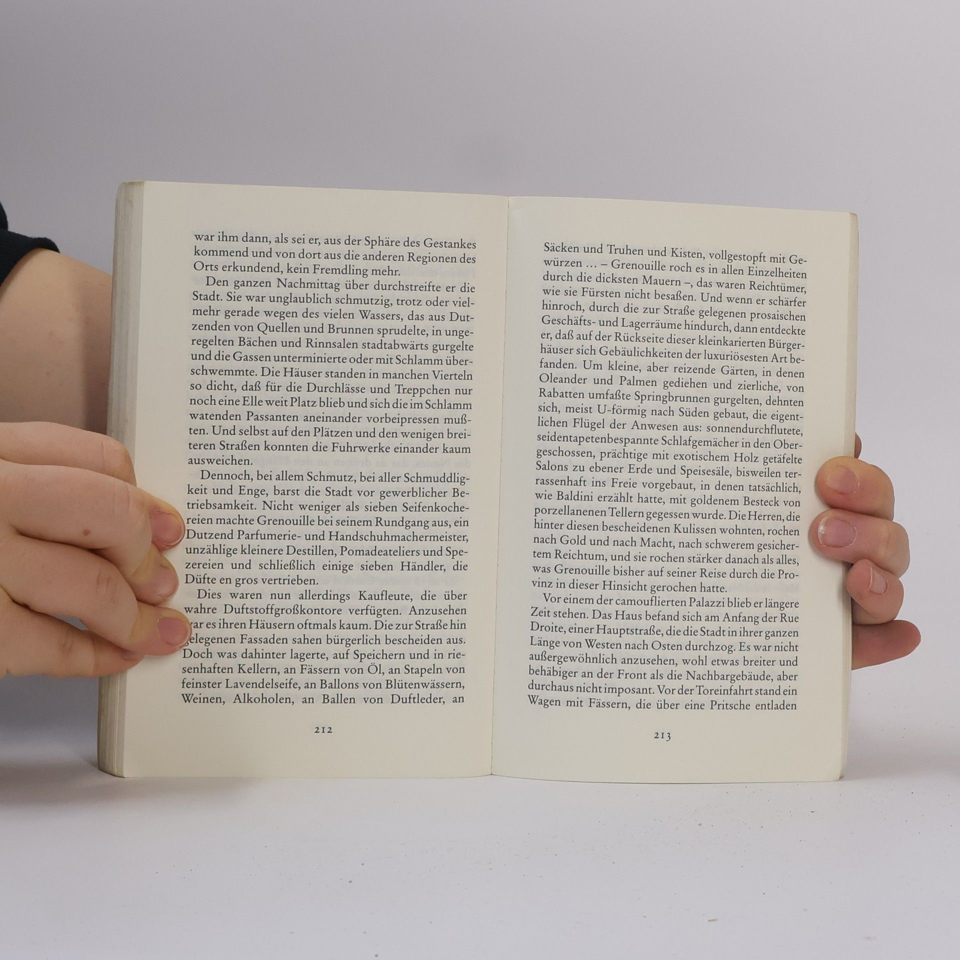 Von Jean-Baptiste Grenouille, dem finsteren Helden, sei nur verraten, daß er 1738 in Paris, in einer stinkigen Fischbude, geboren wird. Die Ammen, denen das Kerlchen an die Brust gelegt wird, halten es nur ein paar Tage mit ihm aus: Er sei zu gierig, außerdem vom Teufel besessen, wofür es untrügliche Indizien gebe: den fehlenden Duft, den unverwechselbaren Geruch, den Säuglinge auszuströmen pflegen.