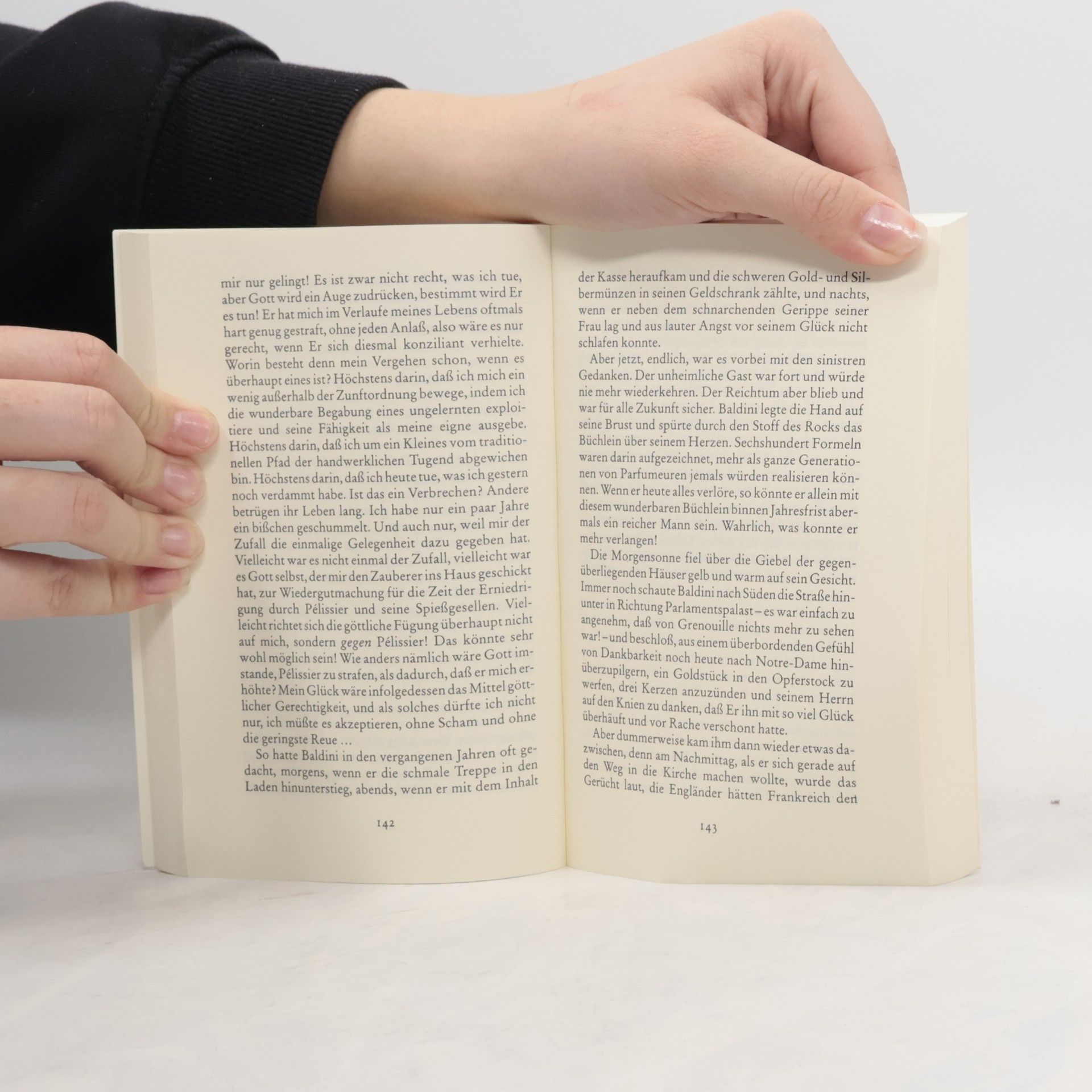 Von Jean-Baptiste Grenouille, dem finsteren Helden, sei nur verraten, daß er 1738 in Paris, in einer stinkigen Fischbude, geboren wird. Die Ammen, denen das Kerlchen an die Brust gelegt wird, halten es nur ein paar Tage mit ihm aus: Er sei zu gierig, außerdem vom Teufel besessen, wofür es untrügliche Indizien gebe: den fehlenden Duft, den unverwechselbaren Geruch, den Säuglinge auszuströmen pflegen.