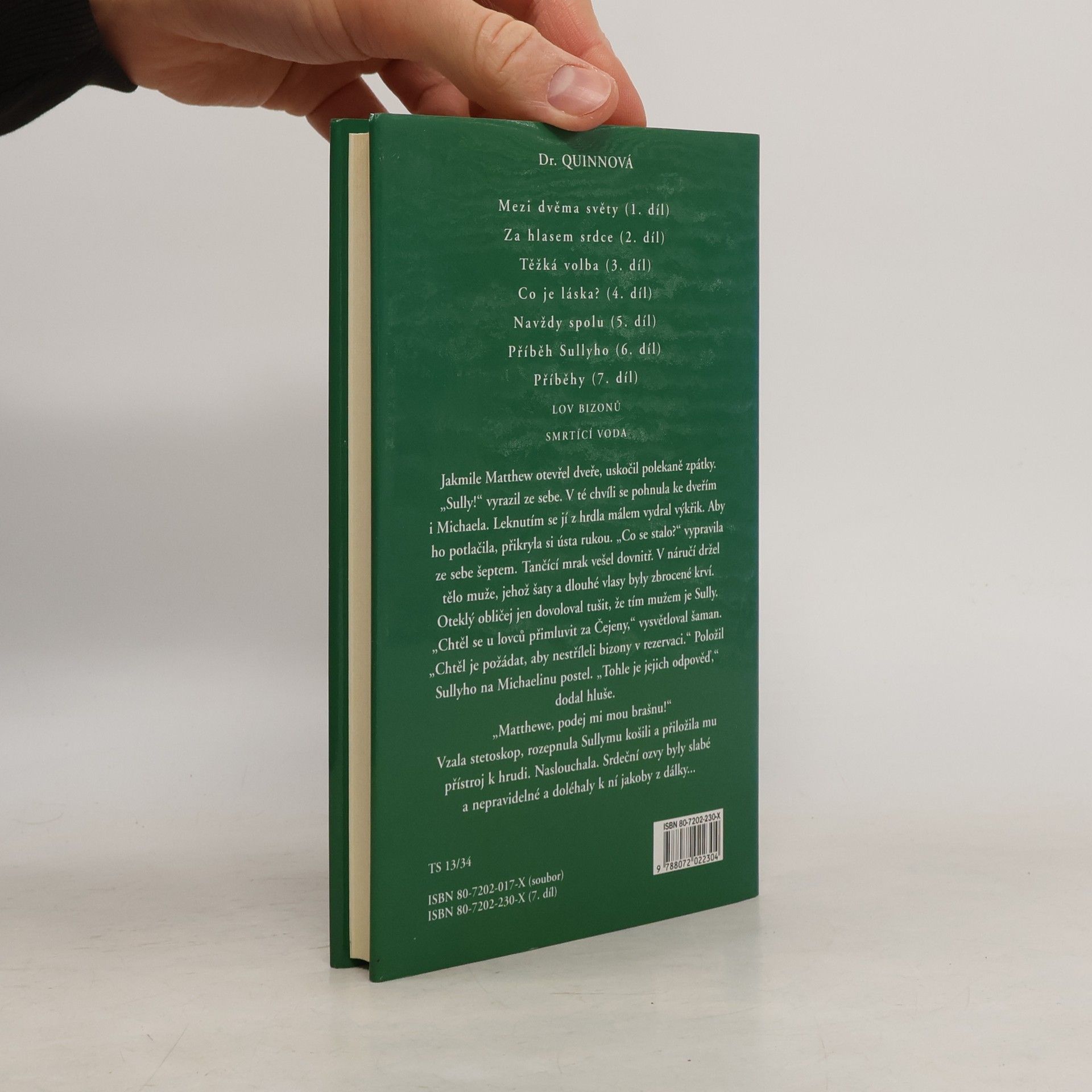 7. díl Příběhy Dorothy Laudanové se vracejí do doby, kdy odvážná doktorka Michaela Quinnová teprve objevuje drsné zvyklosti Divokého západu. V Colorado Springs žije necelý rok a ten čas jí doposud přinesl více zklamání než radosti. Přesto usilovnou prací získává jako žena-lékařka respekt téměř všech obyvatel městečka "na konci světa". Lov bizonů Do Colorado Springs má vést železnice. S pokrokem však přicházejí do městečka i podvodníci. Pan Birch skupuje pozemky jménem Continental Republic Railroad. S ním se objevují i lovci bizonů, kteří chtějí prostor, kudy povede železnice, "vyčistit" pro příští stavbu. Ničí tím zdroj potravy indiánského kmene Čejenů. Spor chce vyřešit Sully, ale banda lovců je silnější. Tančící oblak přináší polomrtvého muže k doktorce Quinnové, která ho opět postaví na nohy. Smrtící voda Brzy poté, co se Sully uzdraví, ohrožuje životy obyvatel Colorado Springs další katastrofa. Pan Harding, majitel rudných dolů, používá na vymytí zlata z rudy rtuť, která se dostává do řeky Fountain Creek, z níž používá vodu téměř celé město. Počet pacientů s otravou rychle roste. Michaela se rozhodne zabránit smrtelnému nebezpečí. Přes varování přátel se vydává v doprovodu Sullyho na Hardingovy pozemky, aby udělala rozbor vody a našla zdroj "epidemie". Harding je velmi tvrdý muž, ale Michaela přesto dosáhne svého.
