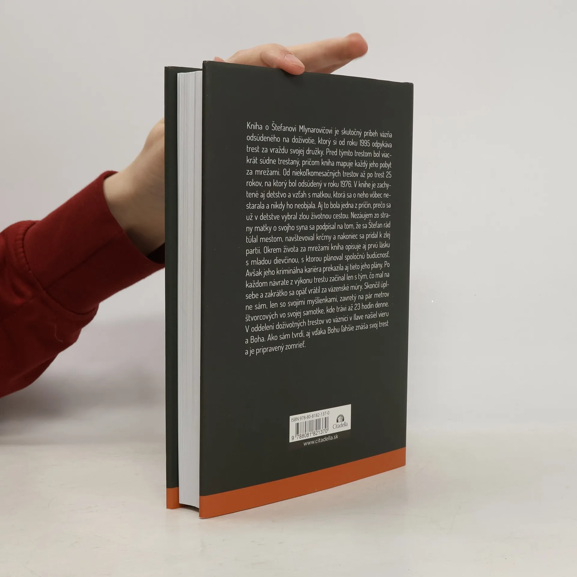 Kniha o Štefanovi Mlynarovičovi je skutočný príbeh väzňa odsúdeného na doživotie, ktorý si od roku 1995 odpykávatrest za vraždu svojej družky. Pred týmto trestom bol viackrát súdne trestaný, pričom kniha mapuje každý jeho pobytza mrežami. Od niekoľkomesačných trestov až po trest 25 rokov, na ktorý bol odsúdený v roku 1976. V knihe je zachytené aj detstvo a vzťah s matkou, ktorá sa o neho vôbec nestarala a nikdy ho neobjala. Aj to bola jedna z príčin, prečo sa už v detstve vybral zlou životnou cestou. Nezáujem zo strany matky o svojho syna sa podpísal na tom, že sa Štefan rád túlal mestom, navštevoval krčmy a nakoniec sa pridal k zlej partii. Okrem života za mrežami kniha opisuje aj prvú lásku s mladou dievčinou, s ktorou plánoval spoločnú budúcnosť.Avšak jeho kriminálna kariéra prekazila aj tieto jeho plány. Po každom návrate z výkonu trestu začínal len s tým, čo mal na sebe a zakrátko sa opäť vrátil za väzenské múry. Skončil úplne sám, len so svojimi myšlienkami, zavretý na pár metrov štvorcových vo svojej samotke, kde trávi až 23 hodín denne.V oddelení doživotných trestov vo väznici v Ilave našiel vieru a Boha. Ako sám tvrdí, aj vďaka Bohu ľahšie znáša svoj trest a je pripravený zomrieť.