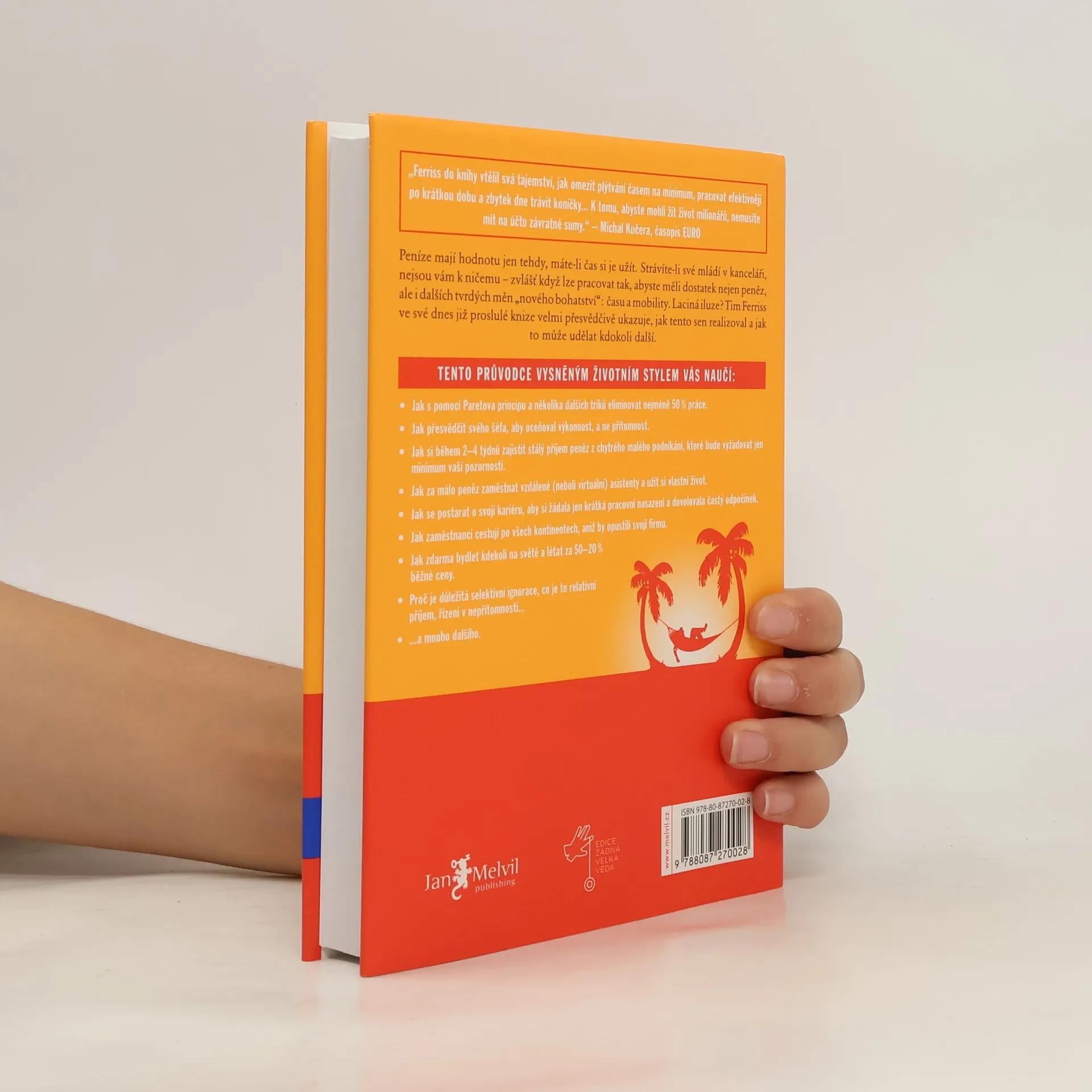 Peníze mají hodnotu jen tehdy, máte-li čas si je užít. Strávíte-li své mládí v kanceláři, nejsou vám k ničemu zvlášť když lze pracovat tak, abyste měli dostatek nejen peněz, ale i dalších tvrdých měn nového bohatství: času a mobility. Laciná iluze? Tim Ferriss ve své dnes již proslulé knize velmi přesvědčivě ukazuje, jak tento sen realizoval a jak to může udělat kdokoli další. Kniha je světovým bestsellerem a vyšla v 35 zemích.