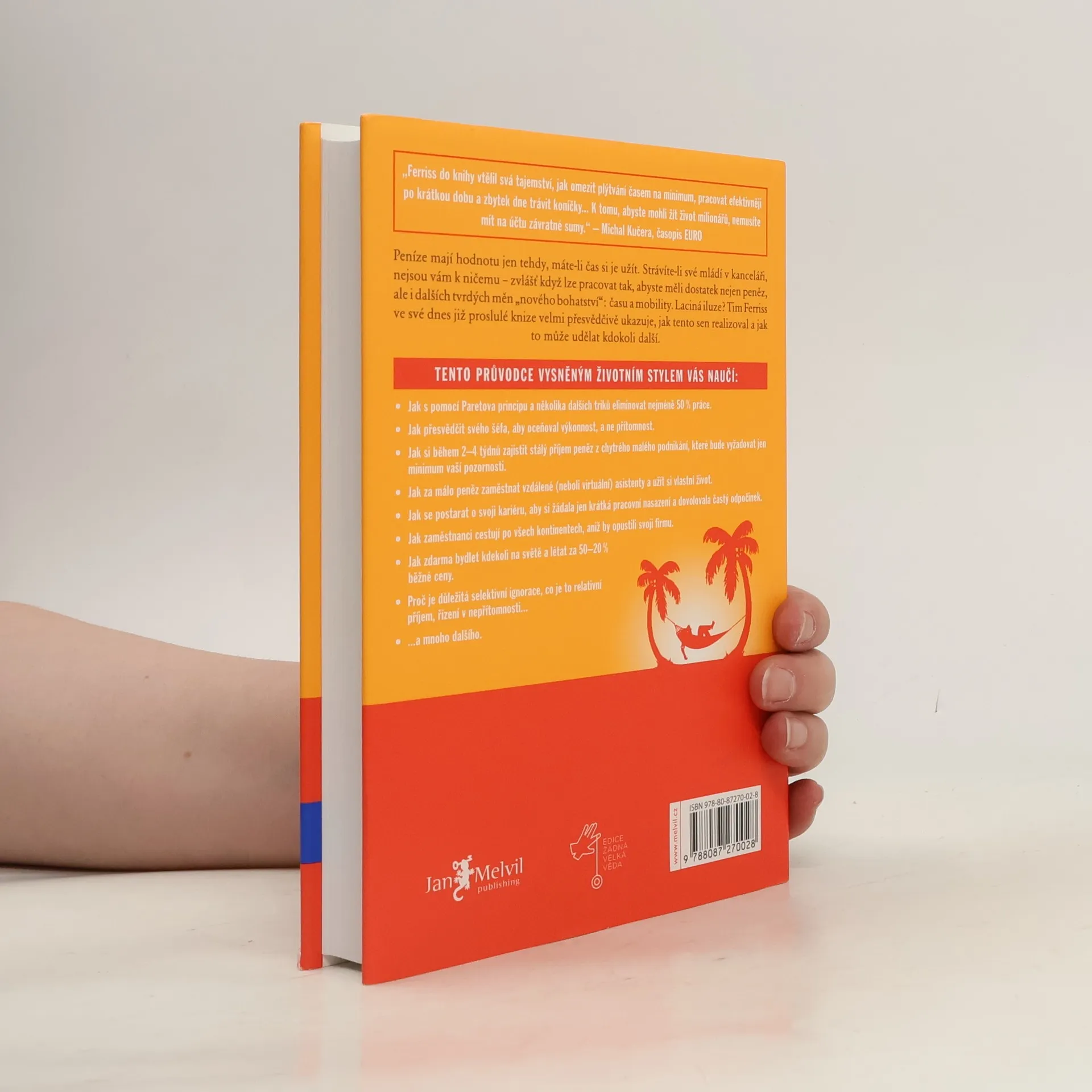 Peníze mají hodnotu jen tehdy, máte-li čas si je užít. Strávíte-li své mládí v kanceláři, nejsou vám k ničemu zvlášť když lze pracovat tak, abyste měli dostatek nejen peněz, ale i dalších tvrdých měn nového bohatství: času a mobility. Laciná iluze? Tim Ferriss ve své dnes již proslulé knize velmi přesvědčivě ukazuje, jak tento sen realizoval a jak to může udělat kdokoli další. Kniha je světovým bestsellerem a vyšla v 35 zemích.