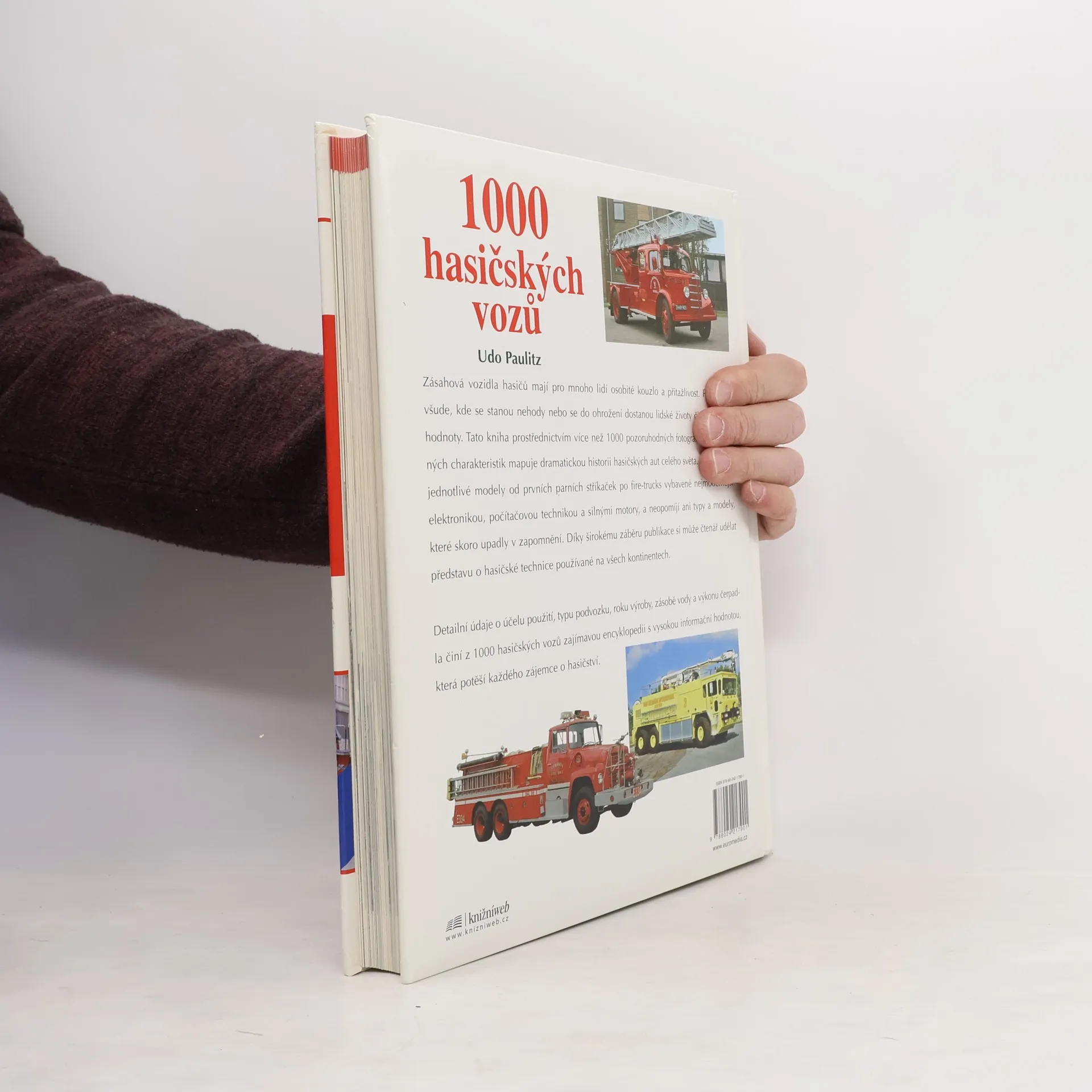 1000 hasičských vozů Udo Paulitz Zásahová vozidla hasičů mají pro mnoho lidí osobité kouzlo a přitažlivost. Pomáhají všude, kde se stanou nehody nebo se do ohrožení dostanou lidské životy či materiální hodnoty. Tato kniha prostřednictvím více než 1000 pozoruhodných fotografií z celého světa a podrobných charakteristik ukazuje dramatickou historii hasičských aut. Představuje jednotlivé modely od prvních parních stříkaček po fire-trucks vybavené nejmodernější elektronikou, počítačovou technikou a silnými motory, a neopomíjí ani typy a modely, které skoro upadly v zapomnění. Vzhledem k širokému záběru knihy se čtenáři nabízí jedinečná možnost udělat si představu o hasičských vozech ze všech světadílů. Detailní údaje o účelu použití, typu podvozku, roku výroby, zásobě vody a výkonu čerpadla z této knihy činí zajímavou encyklopedii s vysokou informační hodnotou, která potěší každého zájemce o hasičství