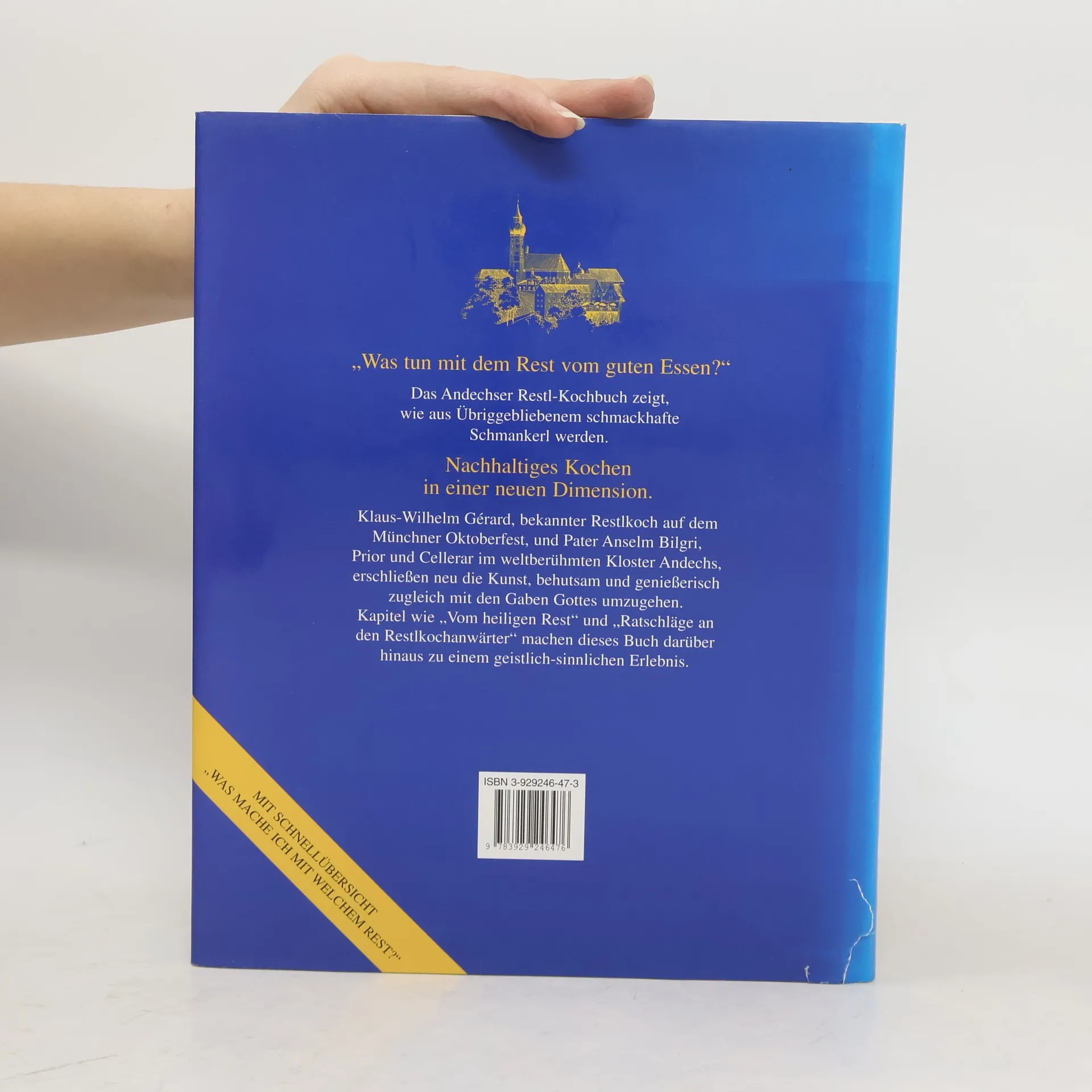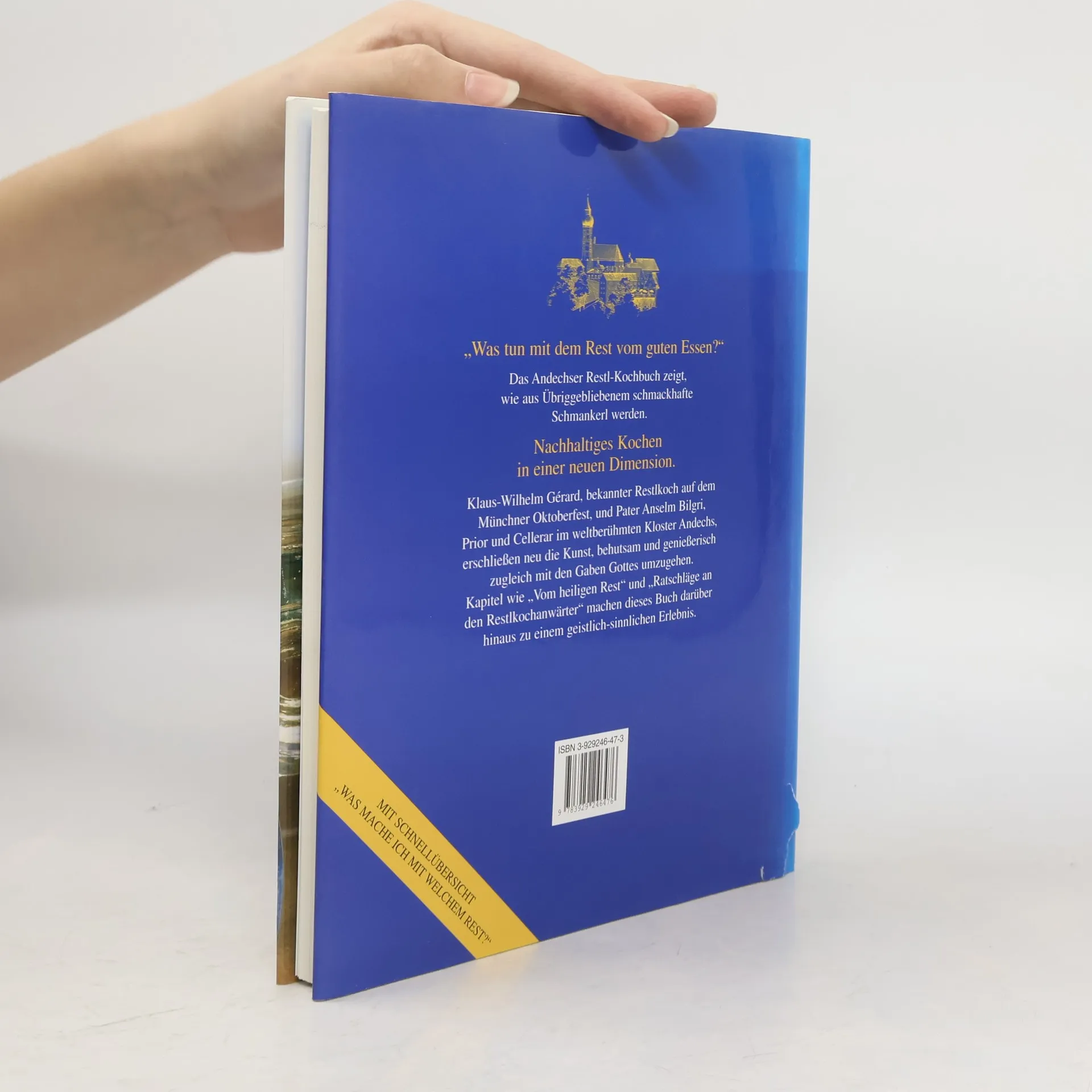 „Was tun mit dem Rest vom guten Essen?“Das Andechser Restl-Kochbuch zeigt, wie aus Übriggebliebenem schmackhafte Schmankerl werden. Nachhaltiges Kochen in einer neuen Dimension. Klaus-Wilhelm Gérard, Leiter vieler Kochseminare und Autor gastronomischer und gastrosophischer Artikel in der Fach- und Tagespresse, und Pater Anselm Bilgri, Prior und Cellerar im weltberühmten Kloster Andechs, erschließen neu die Kunst, behutsam und genießerisch zugleich mit den Gaben Gottes umzugehen. Kapitel wie „Vom heiligen Rest“ und „Ratschläge an den Restlkochanwärter“ machen dieses Buch darüber hinaus zu einem geistlich-sinnlichen Erlebnis.