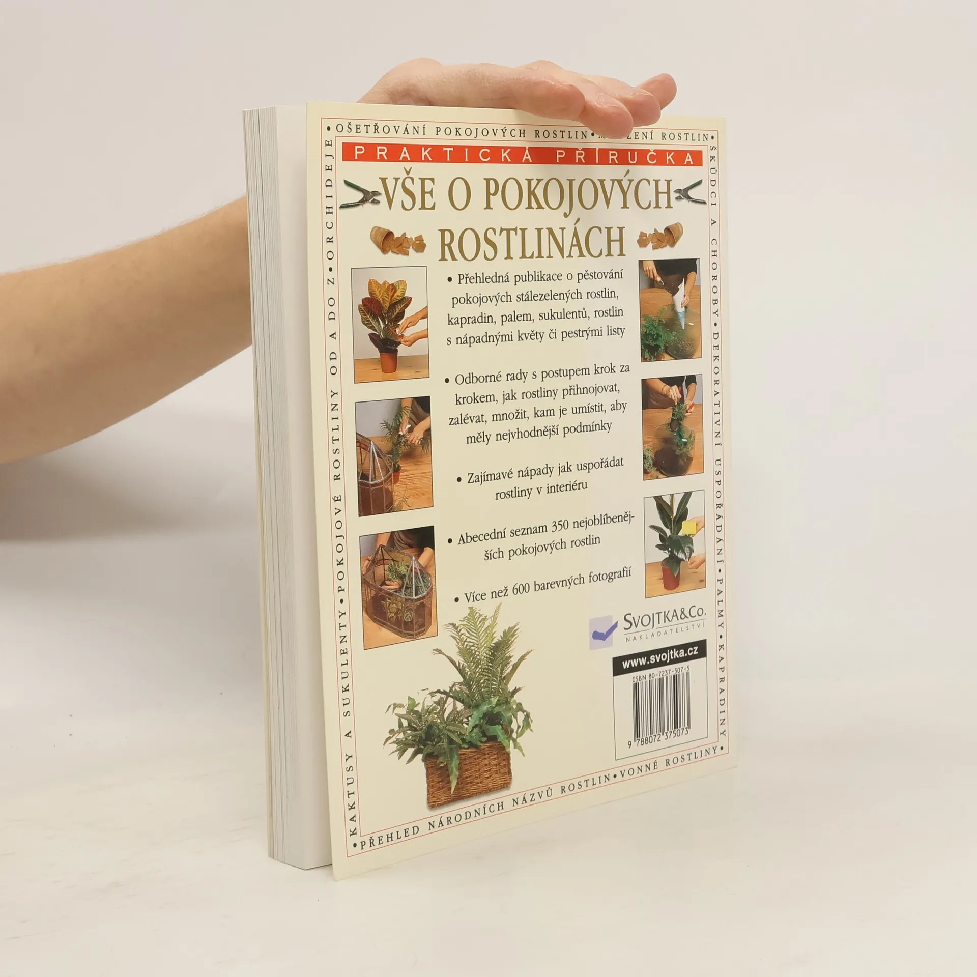 Přehledná publikace o pěstování pokojových stále zelených rostlin, kapradin, palem, sukulentů, rostlin s nápadnými květy či pestrými listy. . Odborné rady s postupem krok za krokem, jak rostliny přihnojovat, zalévat, množit, kam je umístit, aby měly nejvhodnější podmínky . Zajímavé nápady jak uspořádat rostliny v interiéru . Abecední seznam 350 nejoblíbenějších pokojových rostlin . Více než 600 barevných fotografií