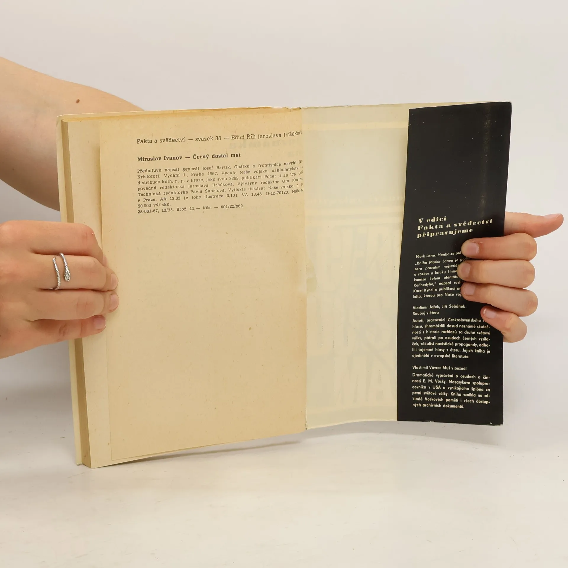 Černý dostal mat : zpráva o čtyřech případech z historie protišpionážního oddělení generálního štábu. Látku poskytly autoru jednak osobní vzpomínky generála J. Bartíka, bývalého vedoucího čs. protišpionážní služby generálního štábu, jednak materiály ministerstva spravedlnosti, vnitra i Vojenského nejvyššího soudu. První reportáž popisuje špionáž čs. důstojníka ve prospěch výmarskéno Německa, druhá skupiny henleinovců ve prospěch nacistického Německa, třetí čs. důstojníka rovněž ve prospěch nacistického Německa, čtvrtá špionáž skupiny, kterou tvořili čs. důstojník, bývalý důstojník rakousko-uherské armády, diplomat a civilisté, ve prospěch Maďarska. Ukazuje i motivy špionáže, dílem finanční a dílem i politické.