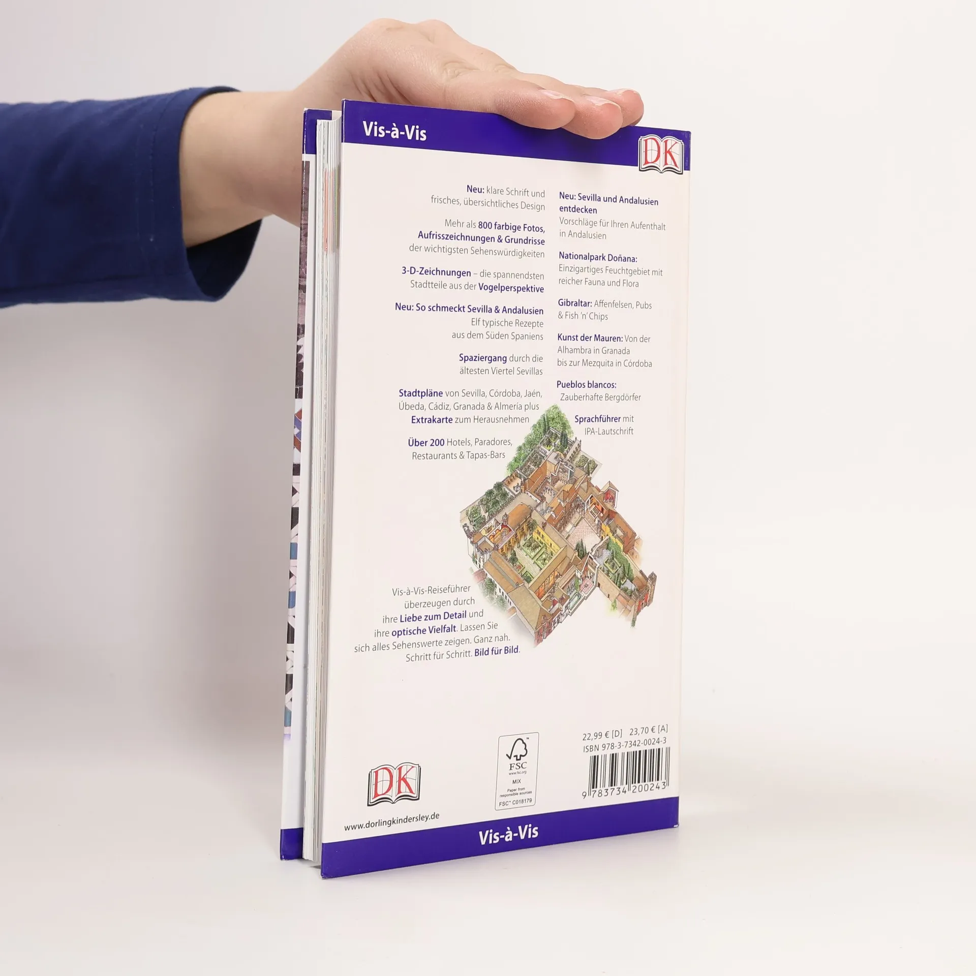 Heißer Flamenco, leckere Tapas, spannende Stierkämpfe, prachtvolle Gotteshäuser, Sonne satt und herrliche Strände ... Andalusien bietet Reisenden alles, was man sich für einen „typisch spanischen“ Urlaub nur wünschen kann. Die südlichste Region Spaniens gehört zu den größten und abwechslungsreichsten des Landes. Im Vis-à-Vis Sevilla und Andalusien finden Sie für jedes Vorhaben alle Informationen, die Sie benötigen: vom Hotel im traditionellen Herrenhaus in Córdoba über die beliebte Tapas-Bar in Málaga bis zum Flamenco-Tanzkurs. Dank detailliertem Stadtplan finden Sie sich in den größten Städten Sevilla, Córdoba, Cádiz, Granada und einigen weiteren mühelos zurecht. Zahlreiche Aufrisszeichnungen illustrieren anschaulich die wichtigsten Sehenswürdigkeiten wie La Giralda und Real Alcázar in Sevilla, die Kathedrale von Cádiz oder Alhambra in Granada. Außerdem gibt es Hinweise zu den traditionellen Heilbädern Andalusiens. Erstmalig bei einem Reiseführer gibt es ein Mini-Kochbuch zum Herausnehmen mit typischen Gerichten der Region. Die hervorragenden Abbildungen - exakte Grundrisse, 3D-Zeichnungen der spannendsten Stadtteile aus der Vogelperspektive und Aufrisszeichnungen - erleichtern Ihnen die Orientierung vor Ort. Der ausführliche Praxisteil bietet aktuelle Angaben zu Hotels, Restaurants, Shopping, Nachtleben und Unterhaltung sowie praktische Tipps zu Verkehrsmitteln, Öffnungszeiten und vieles mehr.