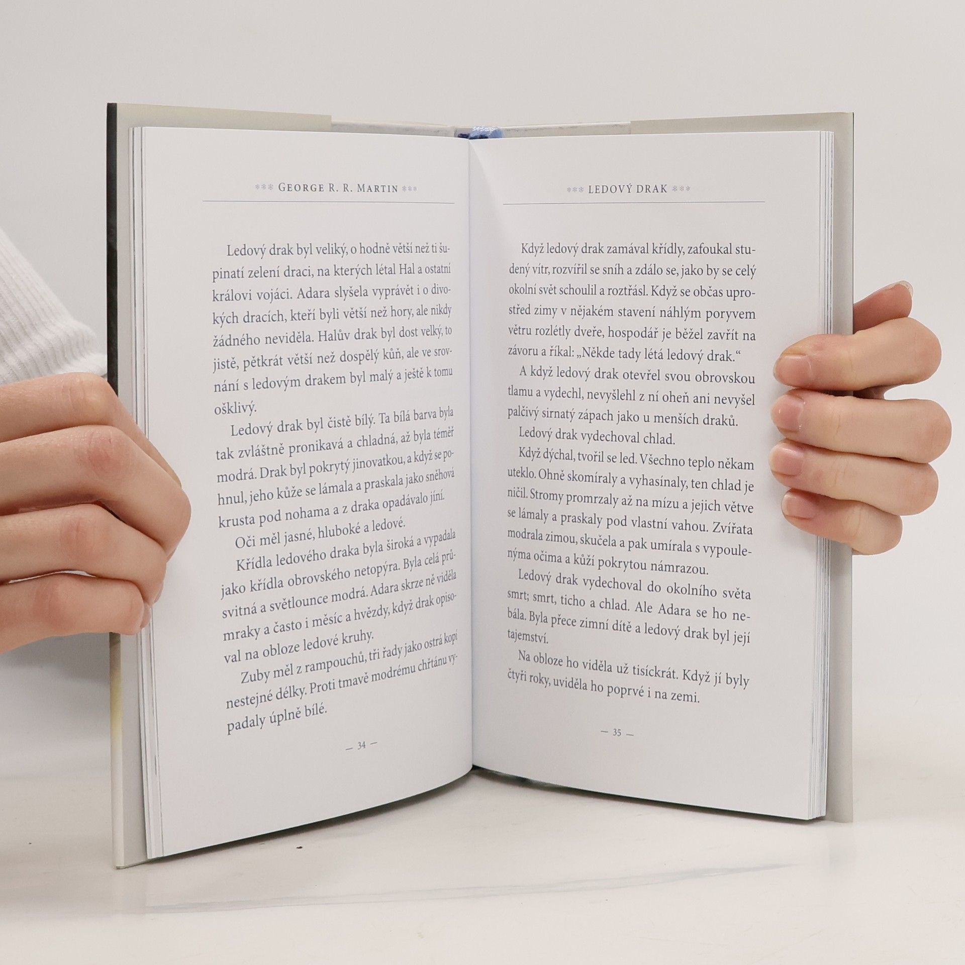 Ledový drak byl stvoření opředené legendami a vzbuzující strach. Žádný člověk totiž ledového draka nikdy nezkrotil. Když přeletěl přes oblohu, zůstala po něm jen strašlivá zima a zmrzlá země. Ale Adara se ho nebála. Adara totiž byla zimní dítě, narodila se za nejkrutějšího mrazu, jaký kdo pamatoval. Už si nevzpomínala, kdy ledového draka spatřila poprvé. Připadalo jí, že byl součástí jejího života odjakživa, že ji zdálky pozoroval, jak si hraje na studeném sněhu, když už ostatní děti dávno utekly do tepla. Když jí byly čtyři roky, poprvé se ho dotkla, a v pěti letech se poprvé proletěla na jeho širokém, chladivém hřbetě. Později, když jí bylo sedm, jednoho klidného letního dne přiletěli ze severu ohniví draci a napadli poklidnou farmu, jež byla Adařiným domovem. A jedině zimní dítě – a ledový drak, který Adaru miloval – dokázali zachránit svět před úplným zničením. Na příběhy Ledového draka, které mu vyprávěla chůva, vzpomíná i Jon Sníh při hlídce na Zdi v Písni ledu a ohně. Ledový drak George R. R. Martina, jednoho z nejrespektovanějších autorů fantasy literatury, doplněný ilustracemi Luise Royo, je nezapomenutelným příběhem o odvaze, lásce a oběti.