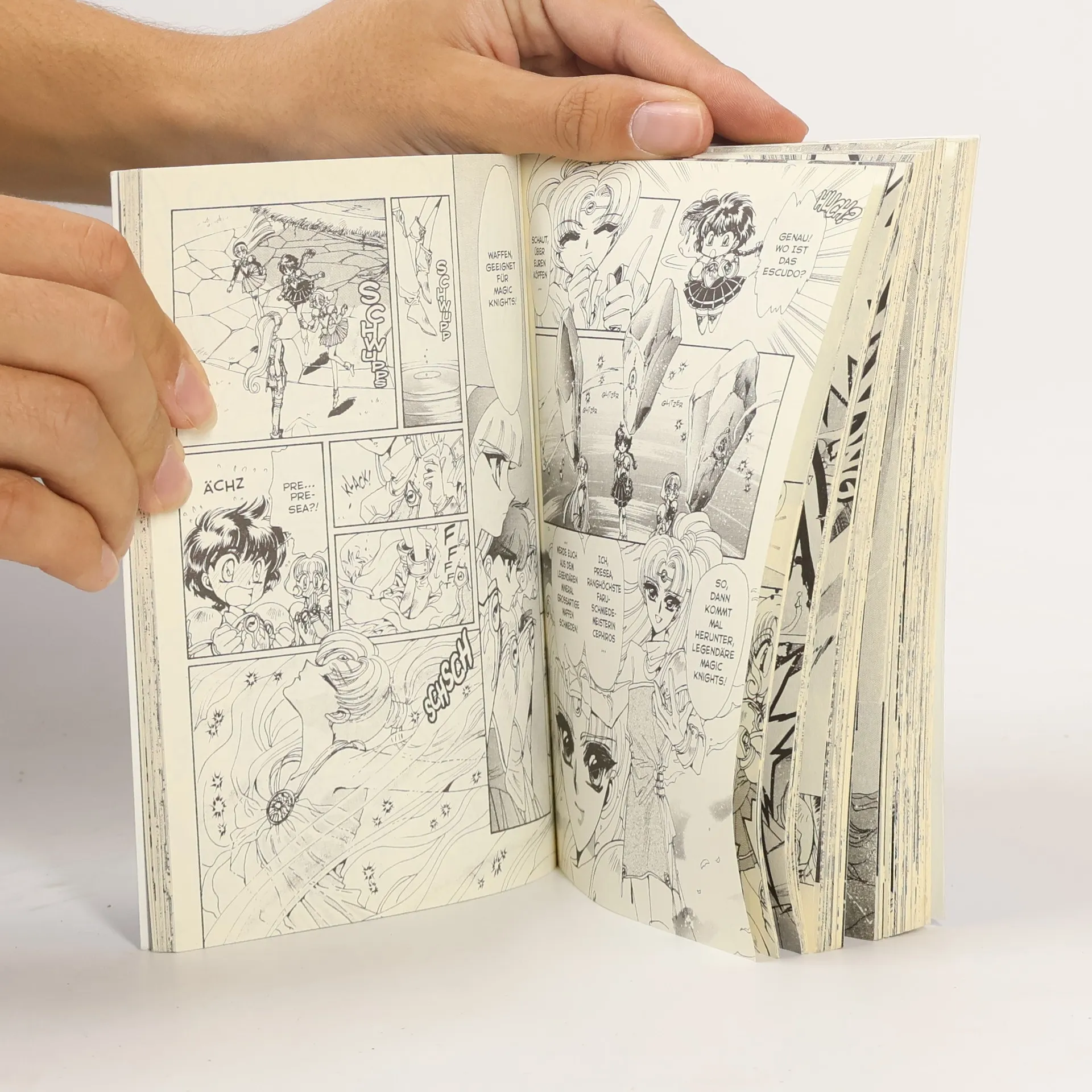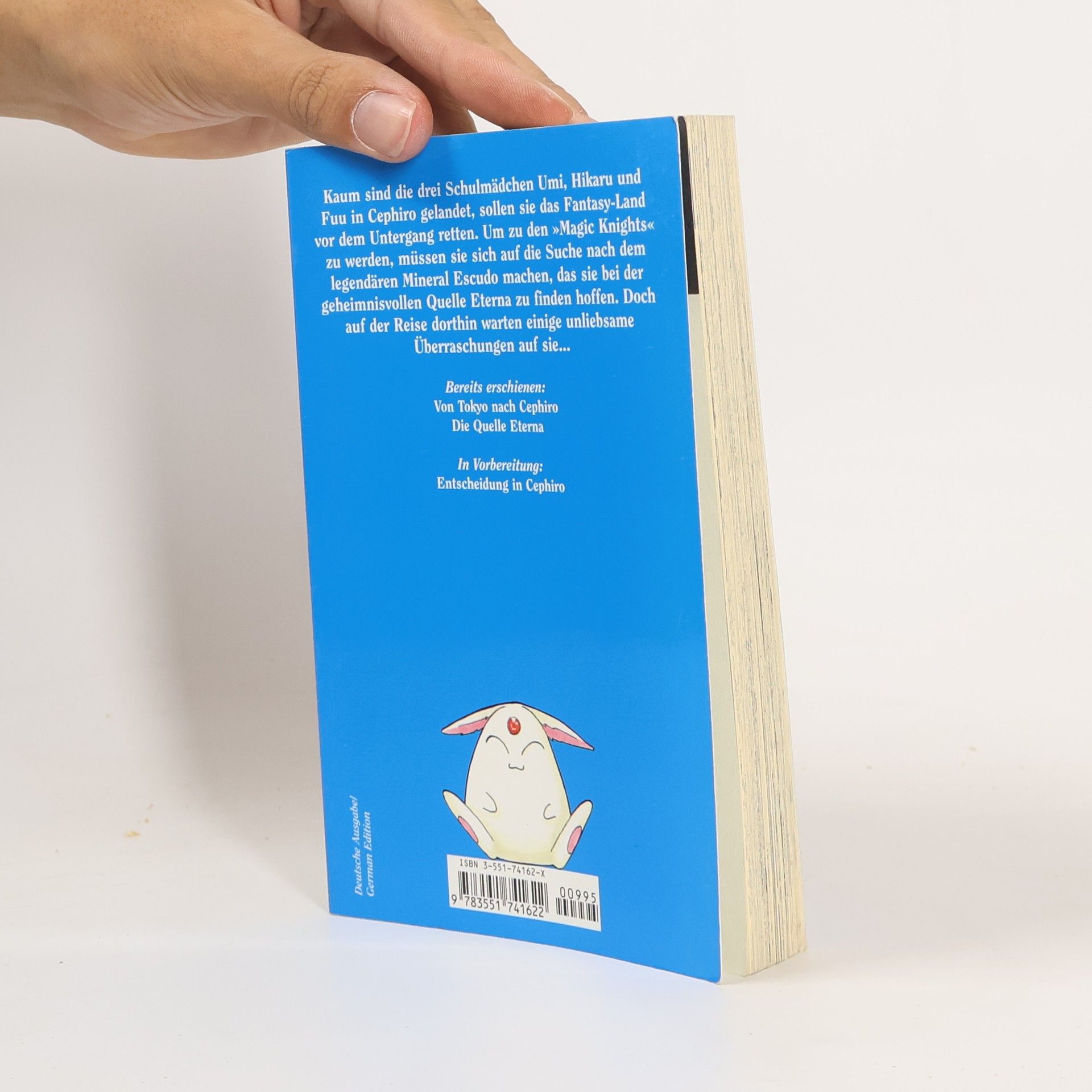 Buchrücken: Kaum sind die drei Schulmädchen Umi, Hikaru und Fuu in Cephiro gelandet, sollen sie das Fantasy-Land vor dem Untergang retten. Um zu den Magic Knights zu werden, mü.ssen sie sich auf die Suche nach dem legendären Mineral Escudo machen, das sie bei der geheimnisvollen Quelle Eterna zu finden hoffen. Doch auf der Reise dorthin warten einige unliebsame Überraschungen auf sie...