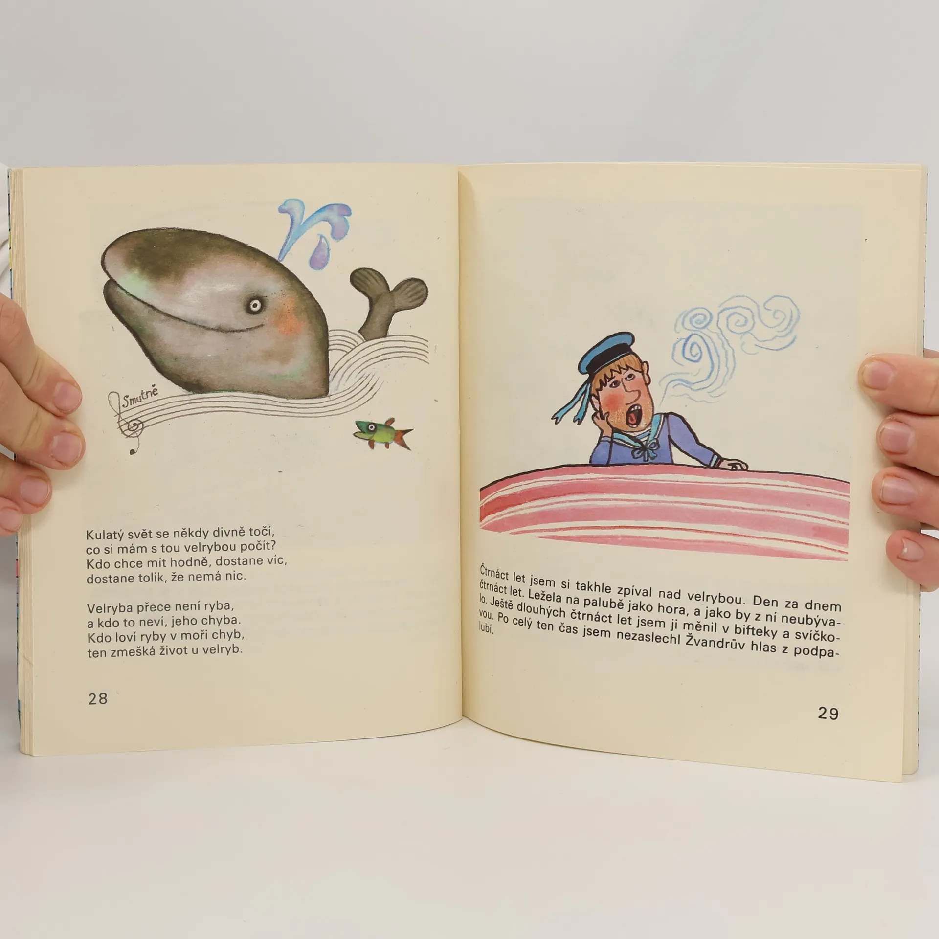 Humorné vyprávění pro mladší čtenáře o tom, jak se osmiletý chlapec dostal mezi piráty. Josef Kolísko, pirát ve výslužbě, vypráví o tom, co všechno zažil jen a jen proto, že jako chlapec nepřečetl knihu, kterou mu daroval knihkupec Rotrekl. Zničehonic se z ní totiž vysypalo třináct krvežíznivých pirátů, popadli ho, spoutali a hodili do kotce na přídi. Žvanivý pirát Žvanda by mu totiž vyžvanil tajemství ztroskotané knížky… Ještě že mu na pomoc přispěchali papoušek s velrybou!
