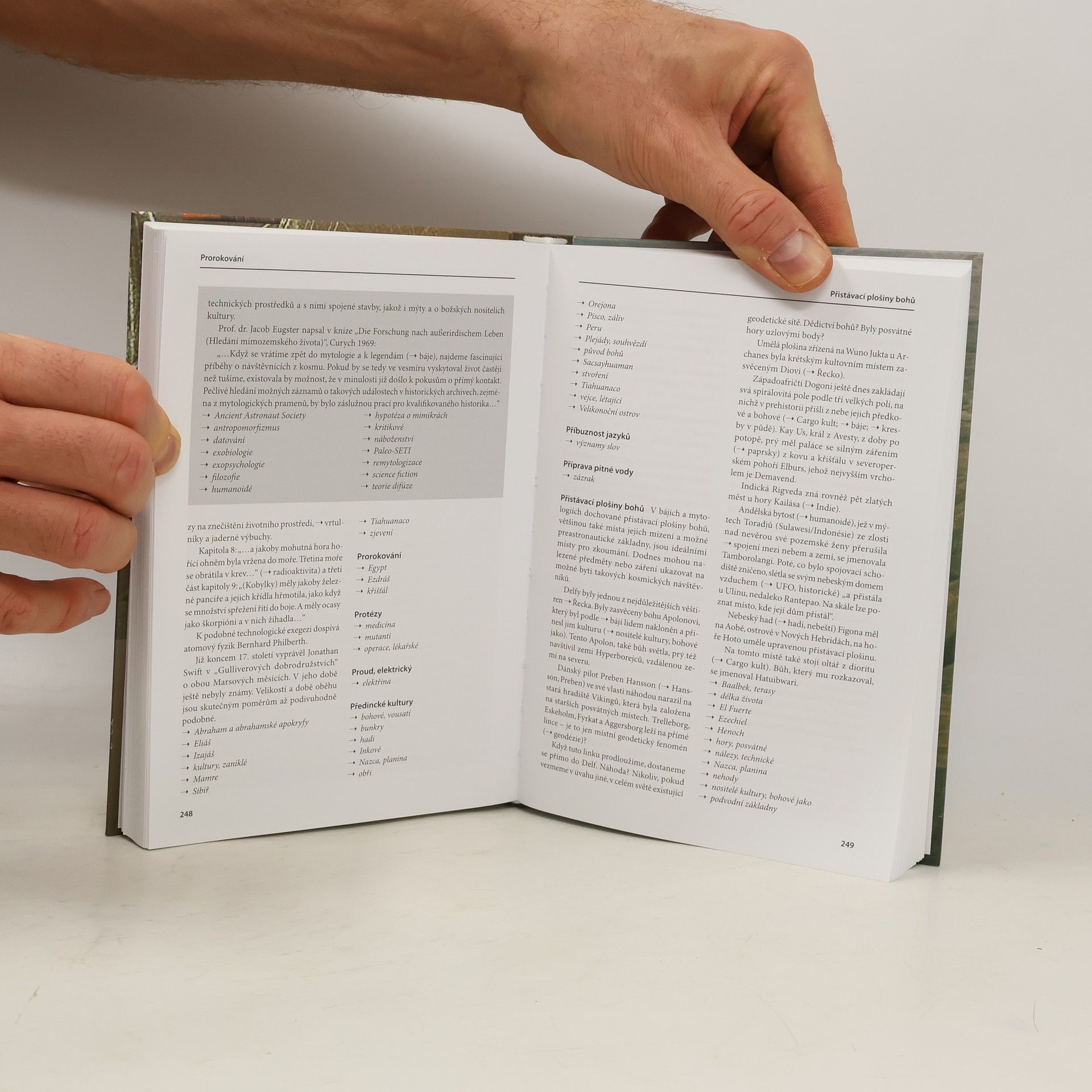 Encyklopedie paleoastronautiky, oboru, který prosazuje víru v kontakty starých civilizací s mimozemšťany. V šedesátých letech dvacátého století přišel švýcarský hoteliér Erich von Däniken s teorií, že mnohé zajímavé skutečnosti, které v kulturách starých pozemských civilizací objevuje moderní věda, aniž by je dokázala jednoznačně vysvětlit, jsou památkou na návštěvy mimozemšťanů, kteří v oněch dobách zřejmě s velkou oblibou navštěvovali naši planetu. Původně čistě populární Dänikenovy knihy získaly časem široký okruh přívrženců, jejichž sebevědomí stále rostlo a v současnosti je v souvislosti s touto teorií jejími stoupenci sice opatrně, ale stále hlasitěji skloňováno slovo "věda". Svůj obor nazvali paleoastronautika a odtud byl jen krůček k vydání "seriózní" encyklopedie. Encyklopedie Ericha von Dänikena obsahuje 1500 hesel, věcných i osobních, a shrnuje v podstatě názory "Dänikenistů" na rozličné historické události, archeologické záhady apod. Hesla jsou zpracována přehledně a srozumitelně, kniha je přínosem nejen pro ty, kteří uvedeným teoriím bezvýhradně věří, ale pro každého, koho tato tématika zajímá.