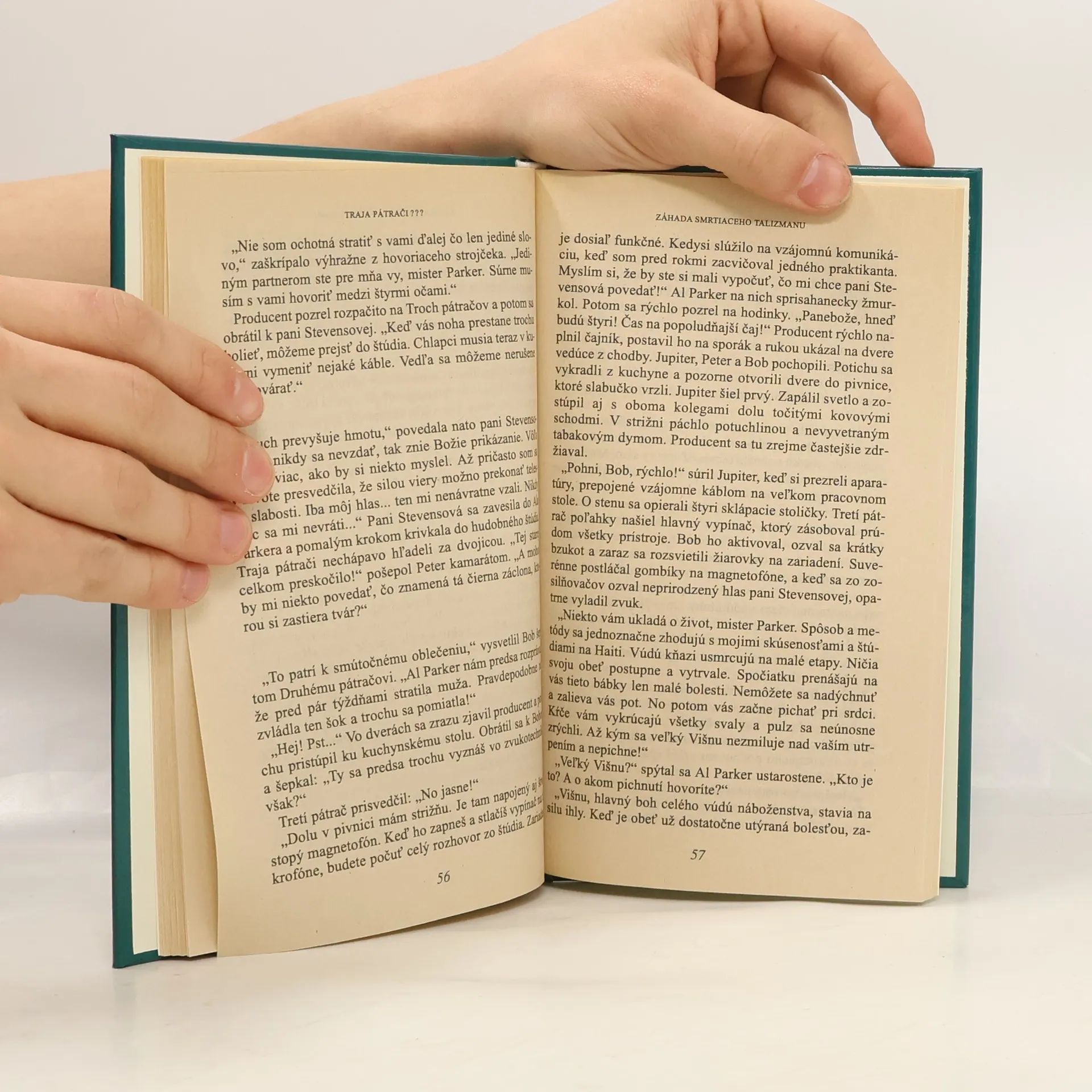 V saune sa Bob náhodou zoznámi s hudobným producentom Alom Parkerom. Náhodou tu nájde zvláštnu bábiku z juty, ktorej tvár sa hrozivo škľabí a úžasne sa podobá na Parkera. Traja pátrači sa domnievajú, že ide o producentov talizman pre šťastie, a rozhodnú sa mu ho vrátiť. Aké je ich prekvapenie, keď Al Parker pri pohľade na bábiku od zdesenia omdlie! Vzápätí sa dozvedajú producentovo tajomstvo: už niekoľko týždňov sa v jeho blízkosti nečakane zjavuje tento čarodejnícky predmet, ktorý zrejme súvisí s prastarým kultom vúdú. Jedna antropologička ho varovala, že keď sa mu nepodarí zlomiť kúzlo talizmanu, môže očakávať veľa zlého. Parker už stráca kontrolu nad situáciou, a tak mu Traja pátrači ponúknu svoje služby. V tej chvíli ešte netušia, s akým mocným a nebezpečným nepriateľom si zmerajú sily.