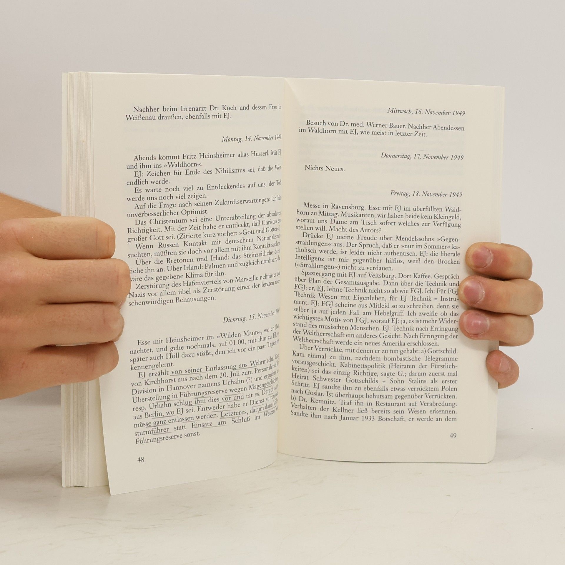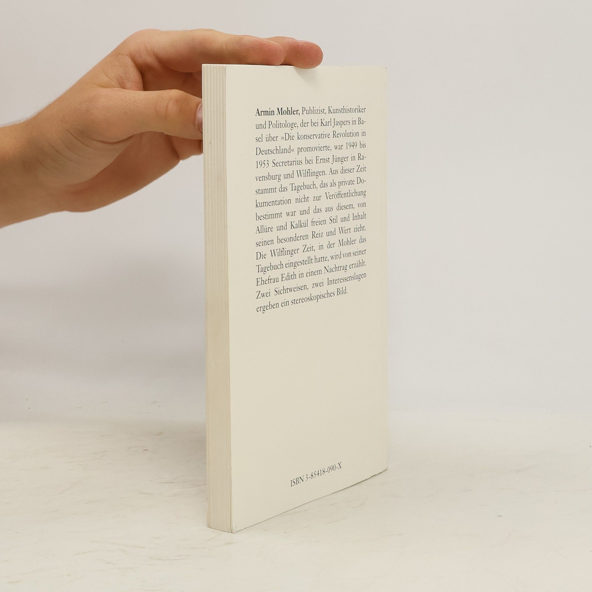 Armin Mohler, Publizist, Kunsthistoriker und Politologe, der bei Karl Jaspers in Basel über „Die konservative Revolution in Deutschland“ promovierte, war 1949 bis 1953 Secretarius bei Ernst Jünger in Ravensburg und Wilflingen. Aus dieser Zeit stammt das Tagebuch, das als private Dokumentation nicht zur Veröffentlichung bestimmt war und das aus diesem, von Allüre und Kalkül freien Stil und Inhalt seinen besonderen Reiz und Wert zieht. Die Wilflinger Zeit, in der Mohler das Tagebuch eingestellt hatte, wird von seiner Ehefrau Edith in einem Nachtrag erzählt. Zwei Sichtweisen, zwei Interessenslagen ergeben ein stereoskopisches Bild. „Picasso ist gefährlicher als Hitler, weil er Mutationen schafft.“ (11.12.1949) „Nein, wir sind in einer Zeit gewaltigen Aufbaus. Ganze Länder werden zusammengeschmolzen für künftige Imperien. In 50 Jahren wird es dem Menschen gut gehen. Ich möchte das Jahr 2000 erleben.“ GJ: „Warum?“ EJ: „Weil ich neugierig bin.“