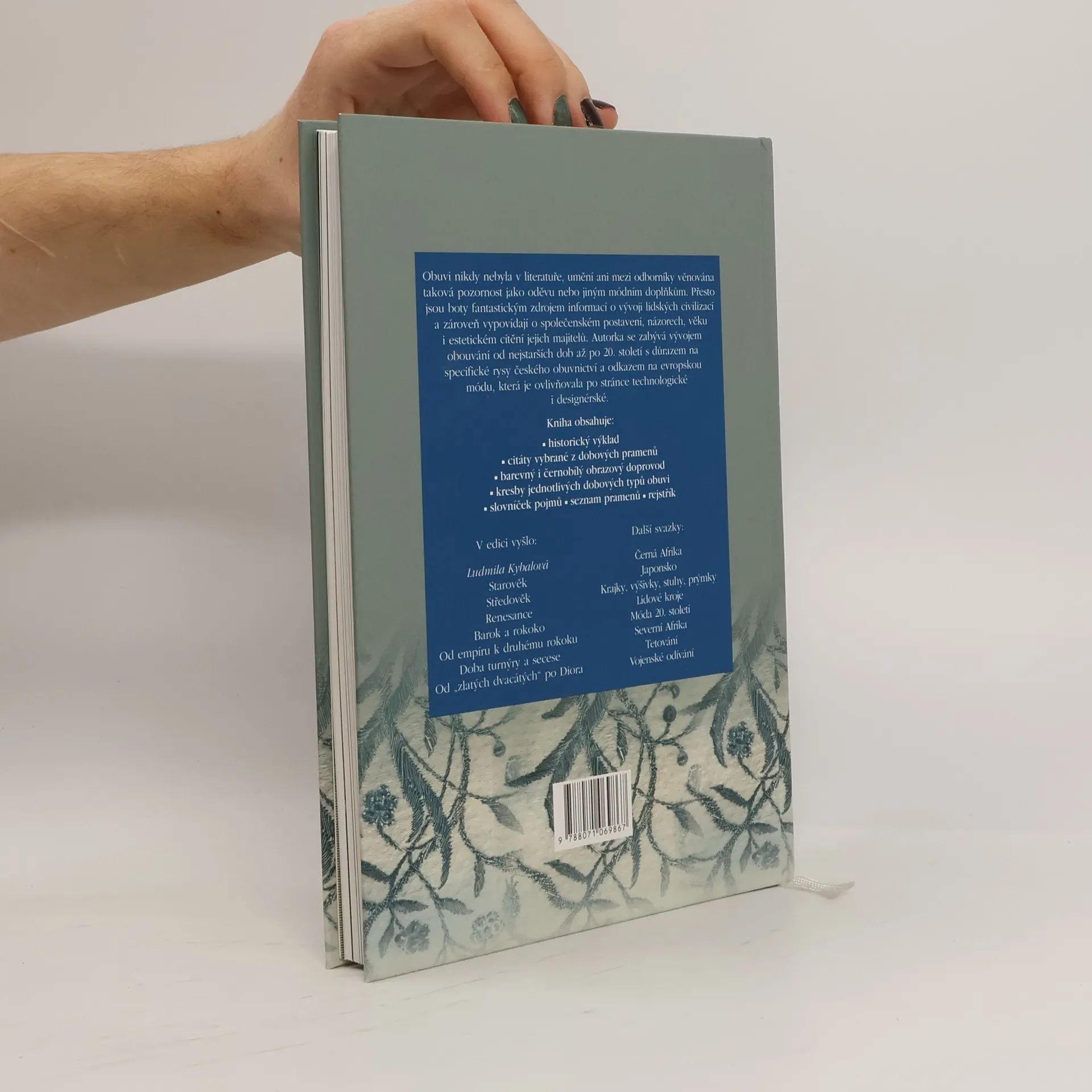 Dějiny obuvnictví a obouvání. Publikace se zabývá vývojovými směry v obouvání od nejstarších civilizací (Mezopotámie, Blízký východ, Egypt, Persie, prehistorická Evropa, antické Řecko a Řím) až po 20. století s důrazem na specifické rysy českého obuvnictví a odkazem na evropskou módu, která pochopitelně do značné míry ovlivňovala obouvání v Čechách po stránce technologické i designérské. Obuv vedle svého praktického využití poskytuje i spoustu informací o životním stylu, řemeslné dovednosti i estetickém cítění lidí v rozmanitých oblastech i epochách. Autorka nás seznamuje s různorodými formami obuvi (lodičky, polobotky atd.) i s jednotlivými typy obuvi a jejich doplňky prostřednictvím řady nákresů a ilustrací. Podrobně se věnuje materiálům (kůže, lýko, papyrus, dřevo i umělé hmoty), ze kterých se boty v jednotlivých epochách vyráběly. Seznamuje nás také s botami tzv. Ötziho, muže z eneolitu, o jejichž nápodobu se úspěšně pokusili výzkumníci ze Zlína. A v závěru se dotkneme i nejnovějších módních trendů a směrů, kterými se vývoj obuvi bude nejspíš ubírat. V knize se dozvíme, jak zajímavou a barvitou historii má tak běžná součást našeho odívání, že si to často ani neuvědomujeme.