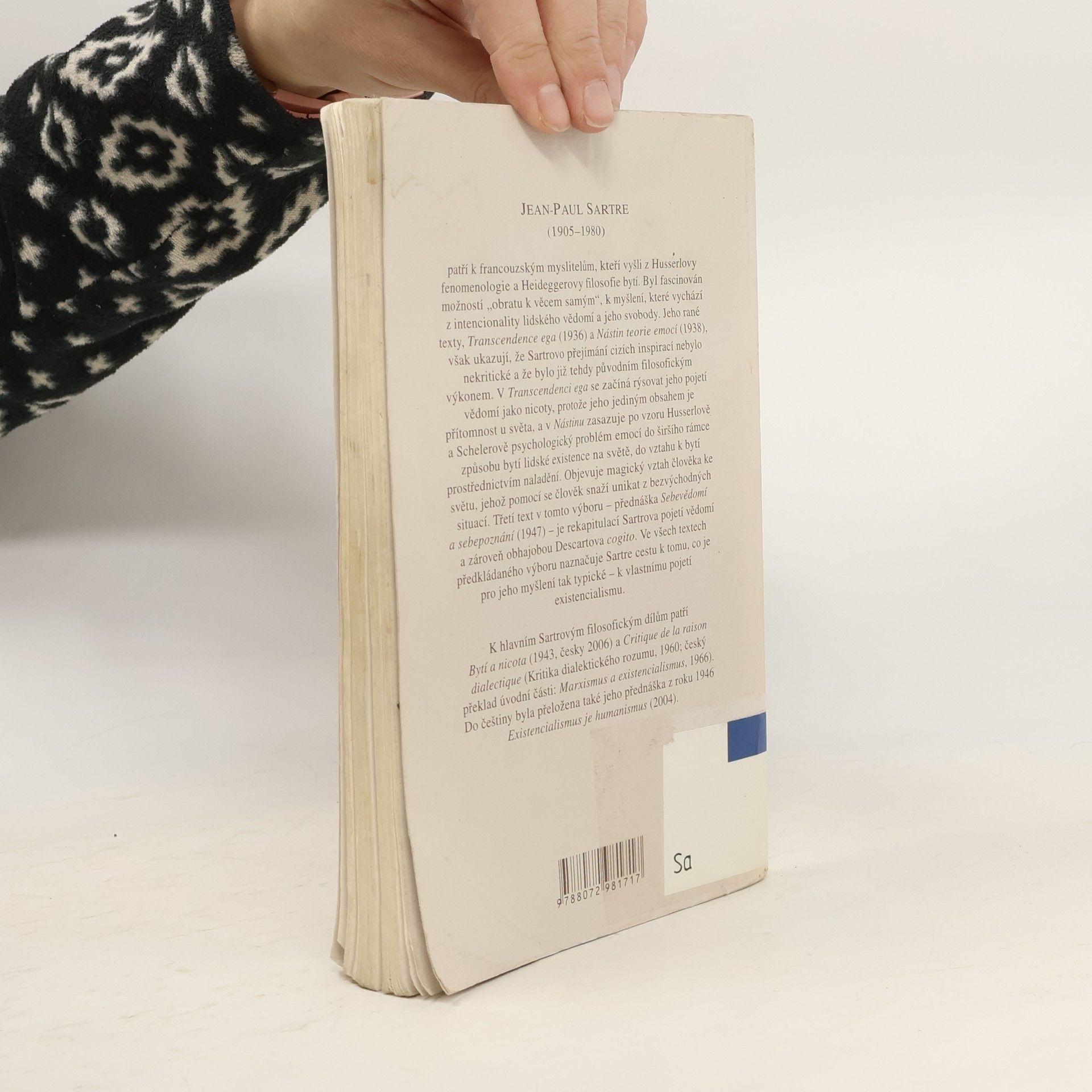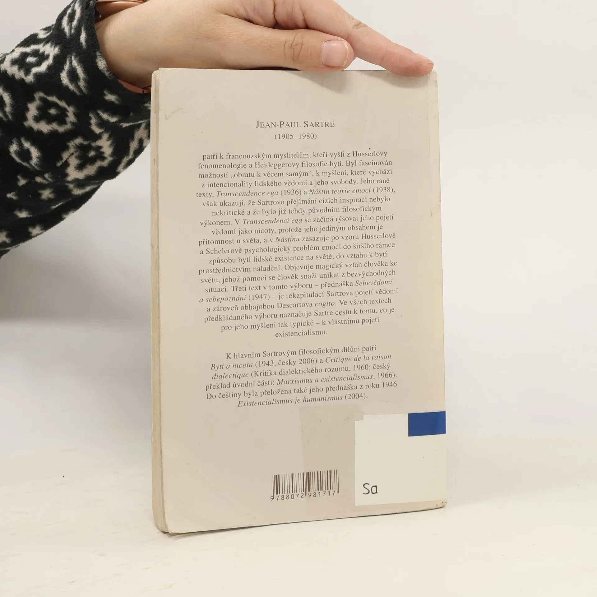 Výbor ze Sartrových kratších textů obsahuje významnou kritiku pojetí “já” ve filosofii vědomí (Transcendence ego, vydáno v roce 1936), dále kritiku psychologických a konkrétněji psychoanalytických představ o emocích, jež ústí do vlastní, fenomenologické analýzy emocionálního chování (Nástin teorie emocí, vydáno v roce 1938), a na závěr přednášku a následnou diskusi o Sebevědomí a sebepoznání (vydáno v roce 1948). Pojítkem všech tří textů je Sartrova představa o vědomí, jež je samo sobě plně přístupné (“průhledné”) a nemůže si před sebou nic zastírat. Proto je lidská existence existencí plně vědomou.