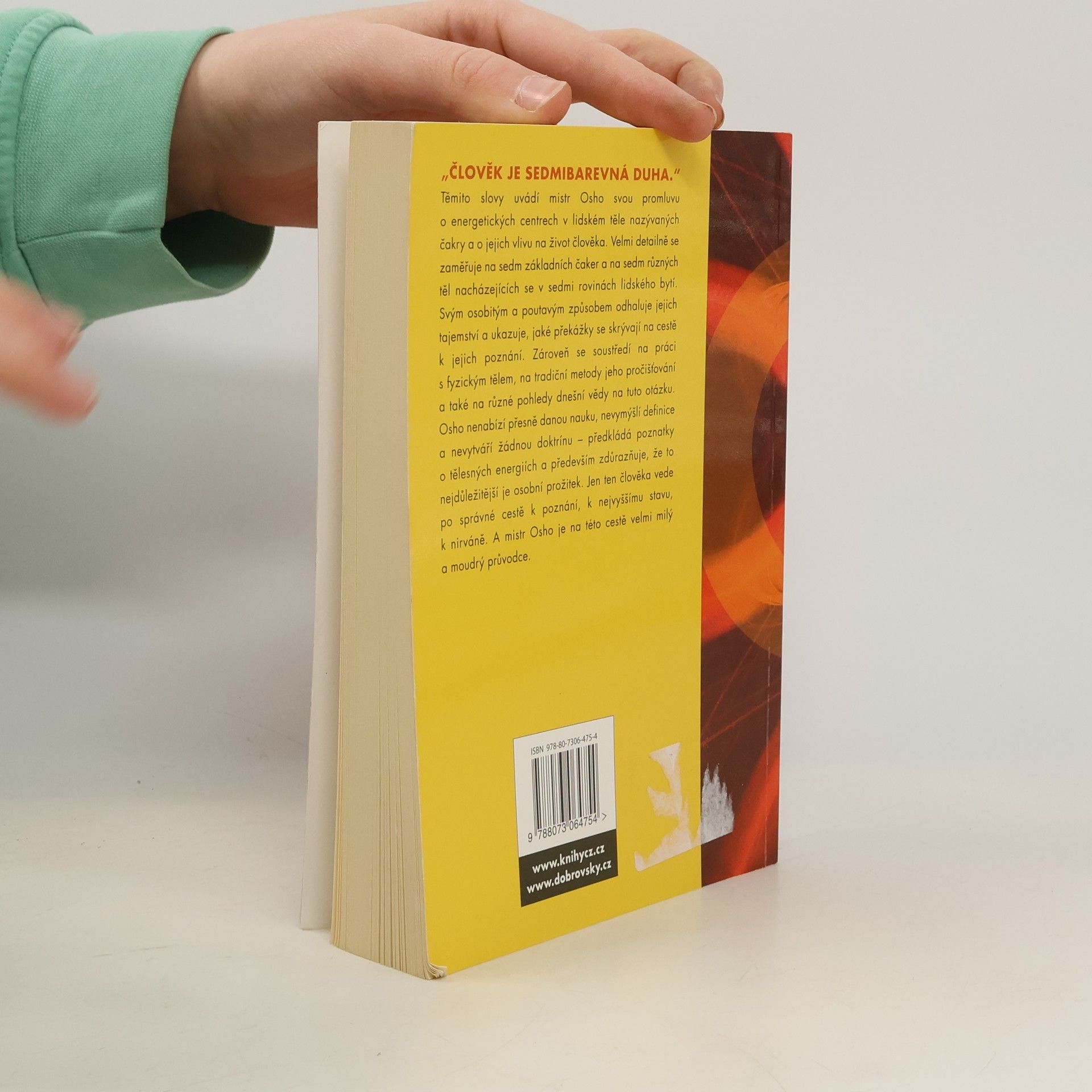 „Člověk je sedmibarevná duha.“ Těmito slovy uvádí mistr Osho svou promluvu o energetických centrech v lidském těle nazývaných čakry a o jejich vlivu na život člověka. Velmi detailně se zaměřuje na sedm základních čaker a na sedm různých těl nacházejících se v sedmi rovinách lidského bytí. Svým osobitým a poutavým způsobem odhaluje jejich tajemství a ukazuje, jaké překážky se skrývají na cestě k jejich poznání. Zároveň se soustředí na práci s fyzickým tělem, na tradiční metody jeho pročišťování a také na různé pohledy dnešní vědy na tuto otázku. Osho nenabízí přesně danou nauku, nevymýšlí definice a nevytváří žádnou doktrínu – předkládá poznatky o tělesných energií a především zdůrazňuje, že to nejdůležitější je osobní prožitek.