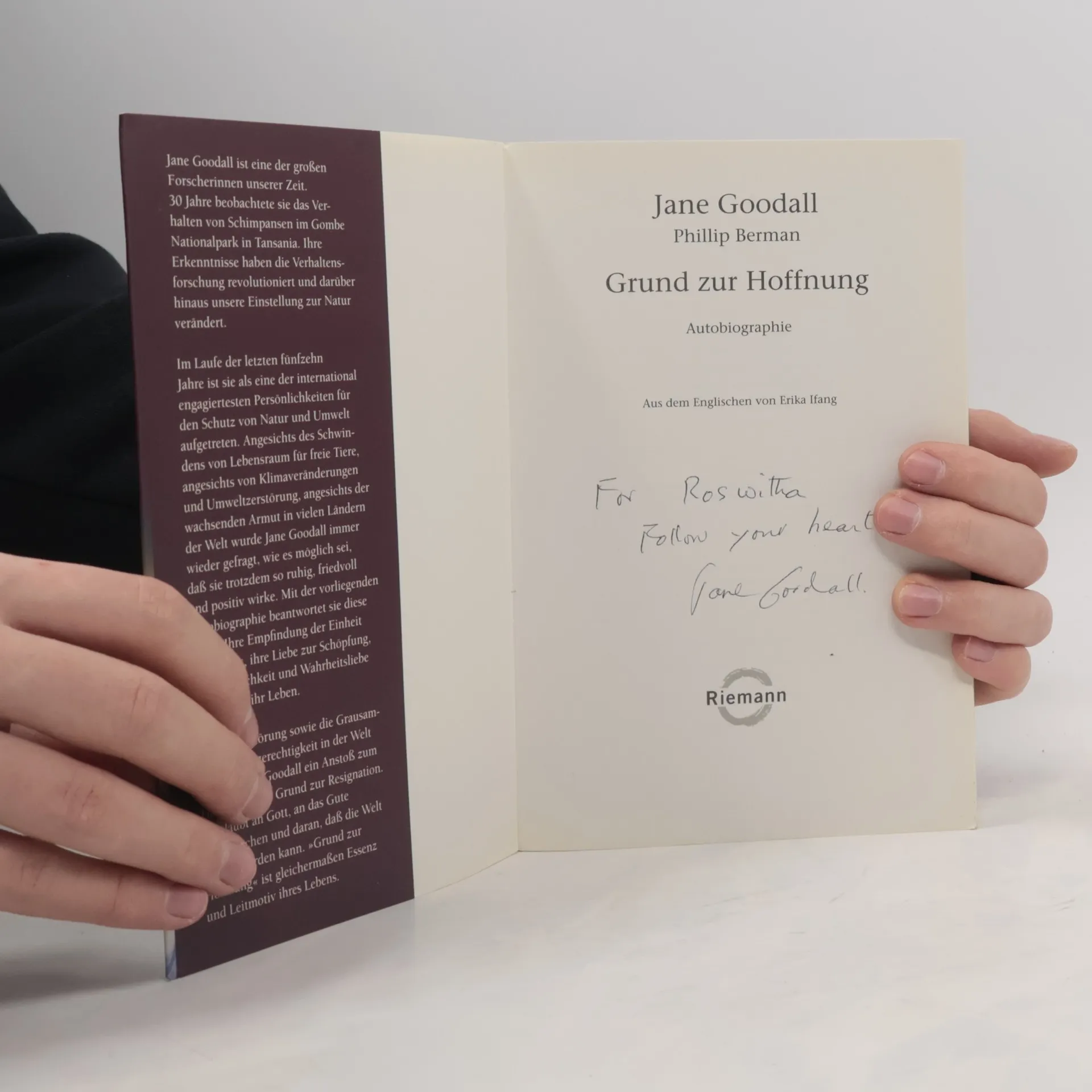 Jane Goodall ist eine der bedeutendsten Forscherinnen unserer Zeit, die über dreißig Jahre das Leben freilebender Schimpansen im Gombe Nationalpark in Tansania beobachtete – die längste Studie dieser Art. Ihre bahnbrechende Arbeit revolutionierte die Verhaltensforschung und veränderte die menschliche Einstellung zur Natur. Angesichts von Umweltzerstörung und Ungerechtigkeit sieht sie nicht Grund zur Resignation, sondern Anstoß zum Handeln. „Grund zur Hoffnung“ ist das zentrale Motiv ihres Lebens. Trotz der Herausforderungen durch den Verlust von Lebensräumen, Klimawandel und wachsende Armut bleibt sie ruhig und positiv. In ihrer Autobiographie erklärt sie, wie ihre Empfindung der Einheit allen Seins, ihre Liebe zur Schöpfung und ihre Herzlichkeit sie prägen. Diese Qualitäten, verbunden mit ihrer Neugier, machten sie zu einer außergewöhnlichen Forscherin, die Tiere respektiert und nicht in Käfige sperrt. Als Doktorin der Ethologie engagiert sich Goodall international für den Schutz von Natur und Umwelt. Seit ihrer aktiven Forschung hat sie sich auf Öffentlichkeitsarbeit konzentriert und ein globales Umweltschutz-Netzwerk für Jugendliche, „Roots and Shoots“, gegründet. Sie glaubt an das Gute im Menschen und daran, dass die Welt geheilt werden kann.